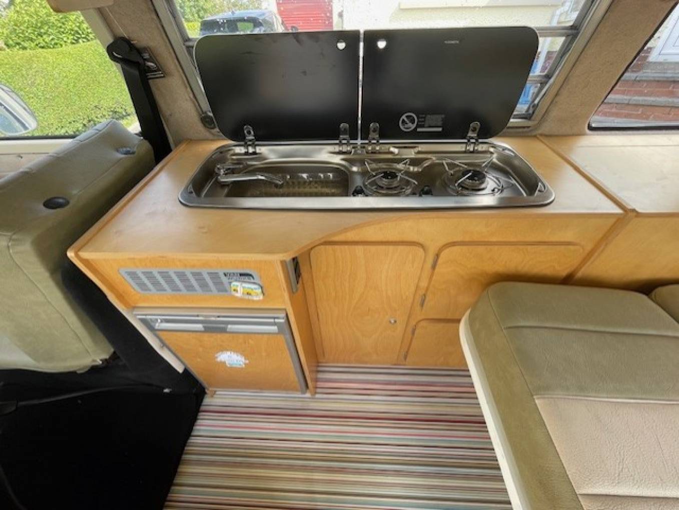 MOT and Tax exempt although it has a MOT certificate until April 2026 with only 40 miles on the new engine. Bodywork is in great condition and there has been a new stainless steel exhaust fitted. Sleeping places for 2 adults with 2 travelling seat belts. The rear bench seat converts into a Rock n Roll bed, your dining table stows away while travelling and there is a built in porta potti. Kitchen is fully equipped with a 2 burner gas hob, 12v compressor fridge and a sink with running water. Additional items fitted include a leisure battery, USB outlets, 2 single mains sockets, interior lighting, fire extinguisher, mains hook up cable and silver screens.