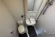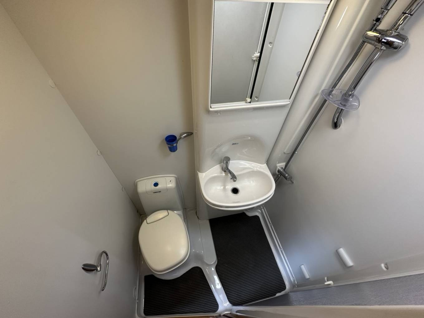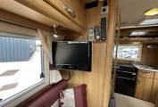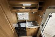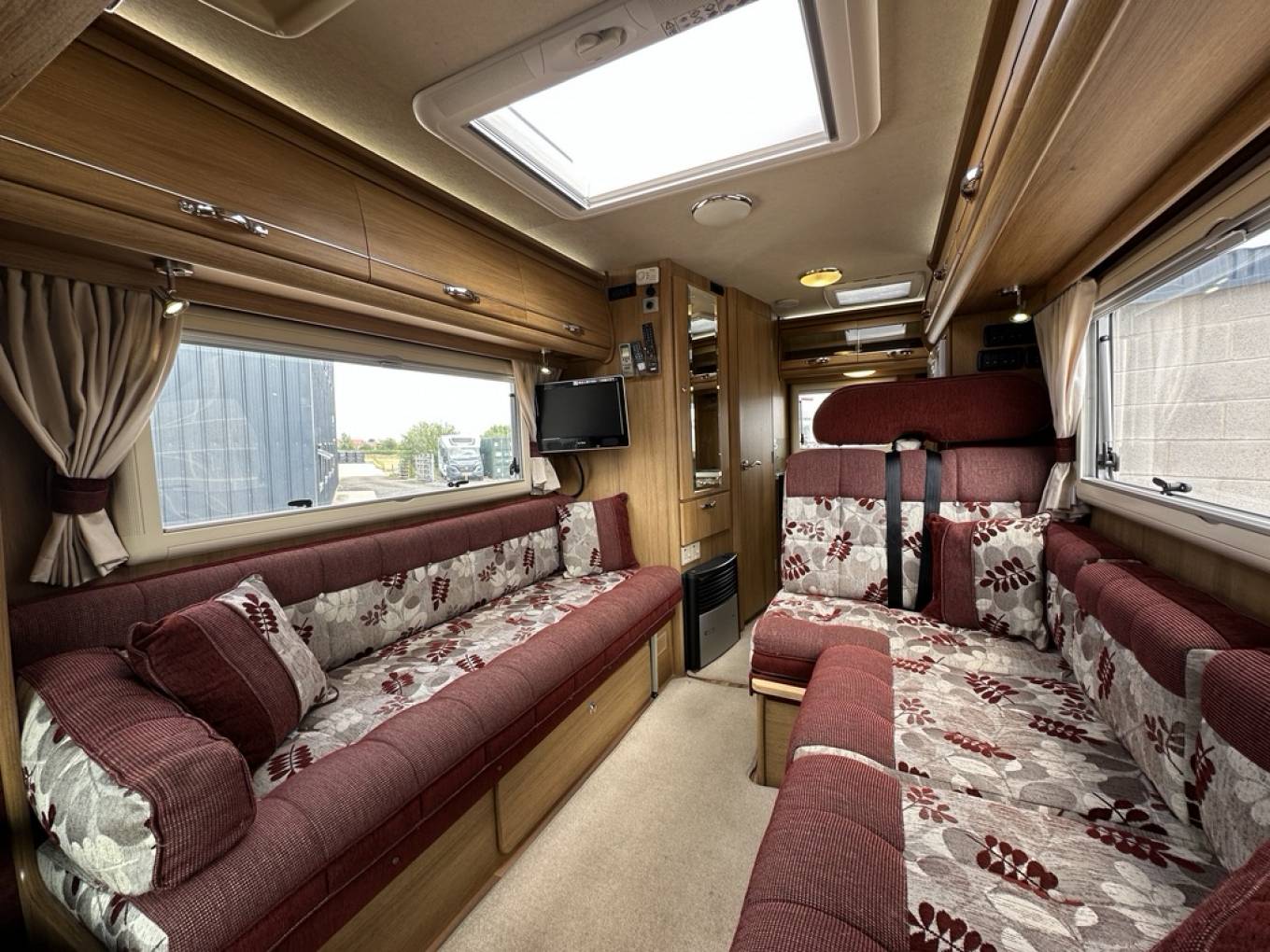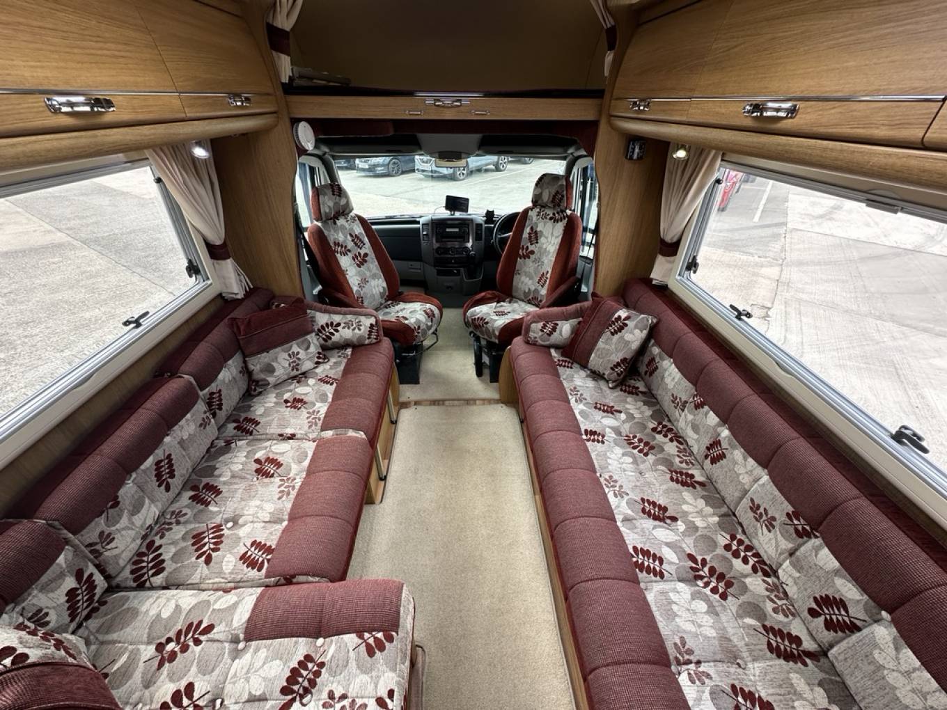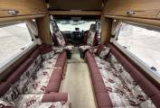 At the front you have a large double overhead cab bed, you then have a lovely L shaped front lounge area it which to relax in with a choice of tables, this area also converts to a double and a small single if needed. At the rear you have the Kitchen area and opposite the side opposite the habitation door is a very well appointed washroom.