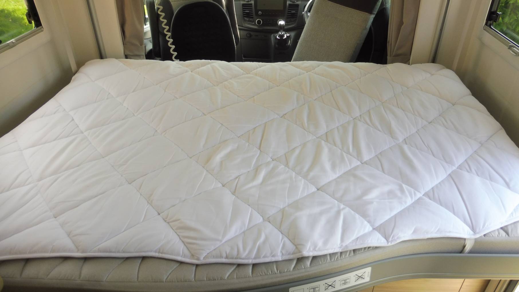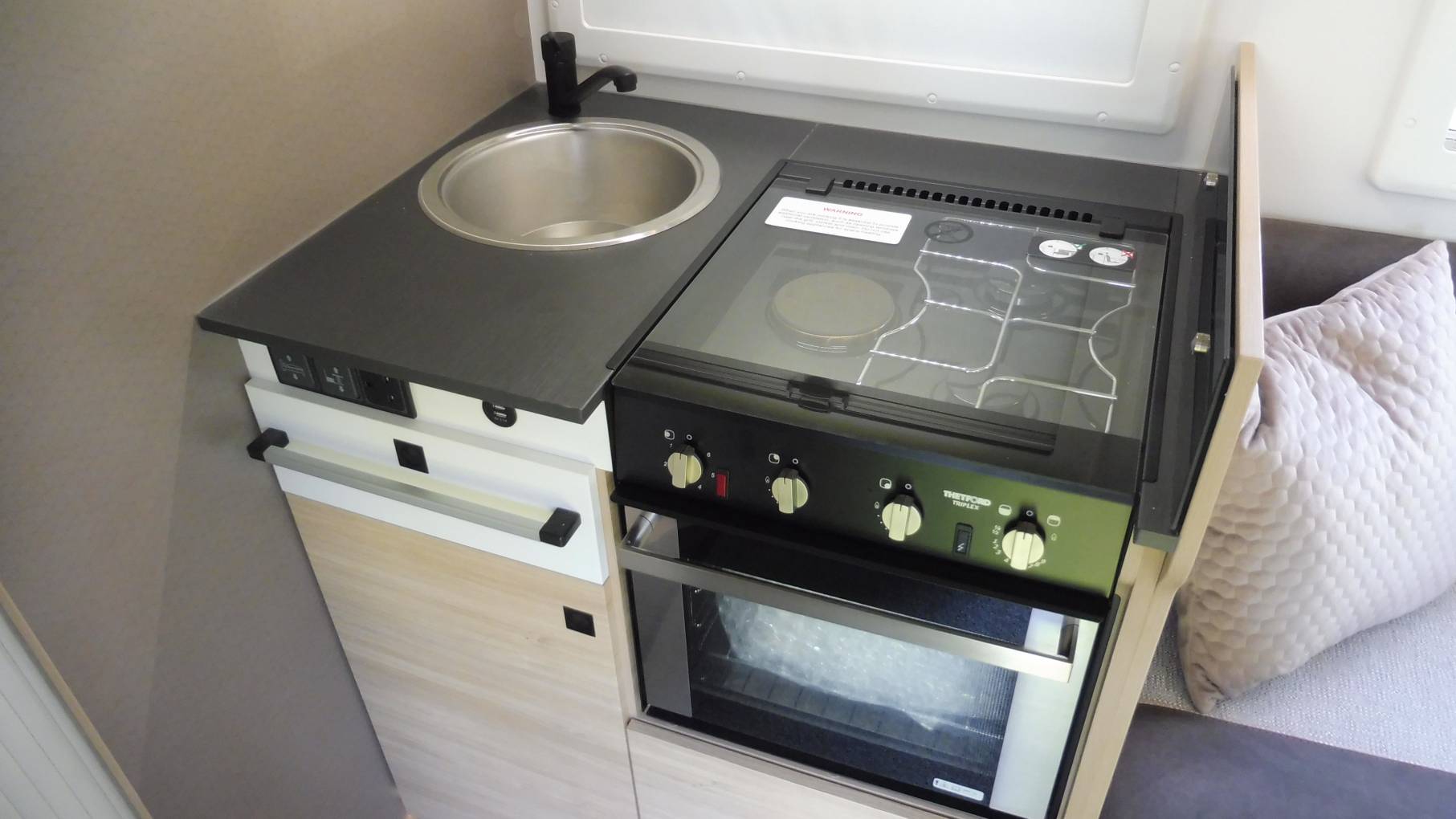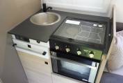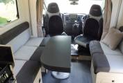 The lounge area allows spacious seating with side sofas around a folding table. When you have additional travellers the space saving seats pop up from under the sofas and fold away when not needed. For your convenience the motorhome is fitted with Wi-fi and an Avtex television.
