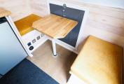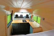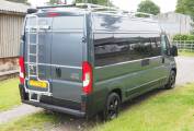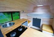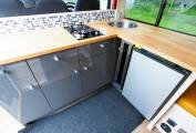 The campervan benefits from electric hook-up, 12v leisure battery with solar panel support, on-board gas bottle, diesel night heater and Propex water heater. A kitchen with plenty of prep space comes with a 2 burner gas hob, sink with mixer tap, fridge with freezer box and a wine cooler. Lots of storage with drawers and cupboard space. A pop up table with box seating provides a place to dine, entertain or even work. The rear transverse bed is a great place to relax and sleep and has a deep filled quilted mattress for comfort. Two skylights alongside the side windows provide plenty of natural light and 12v LED ceiling mounted lights illuminate the interior as the night draws in.
