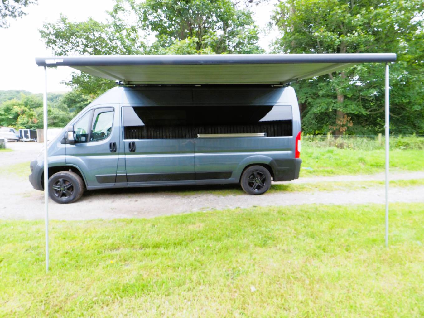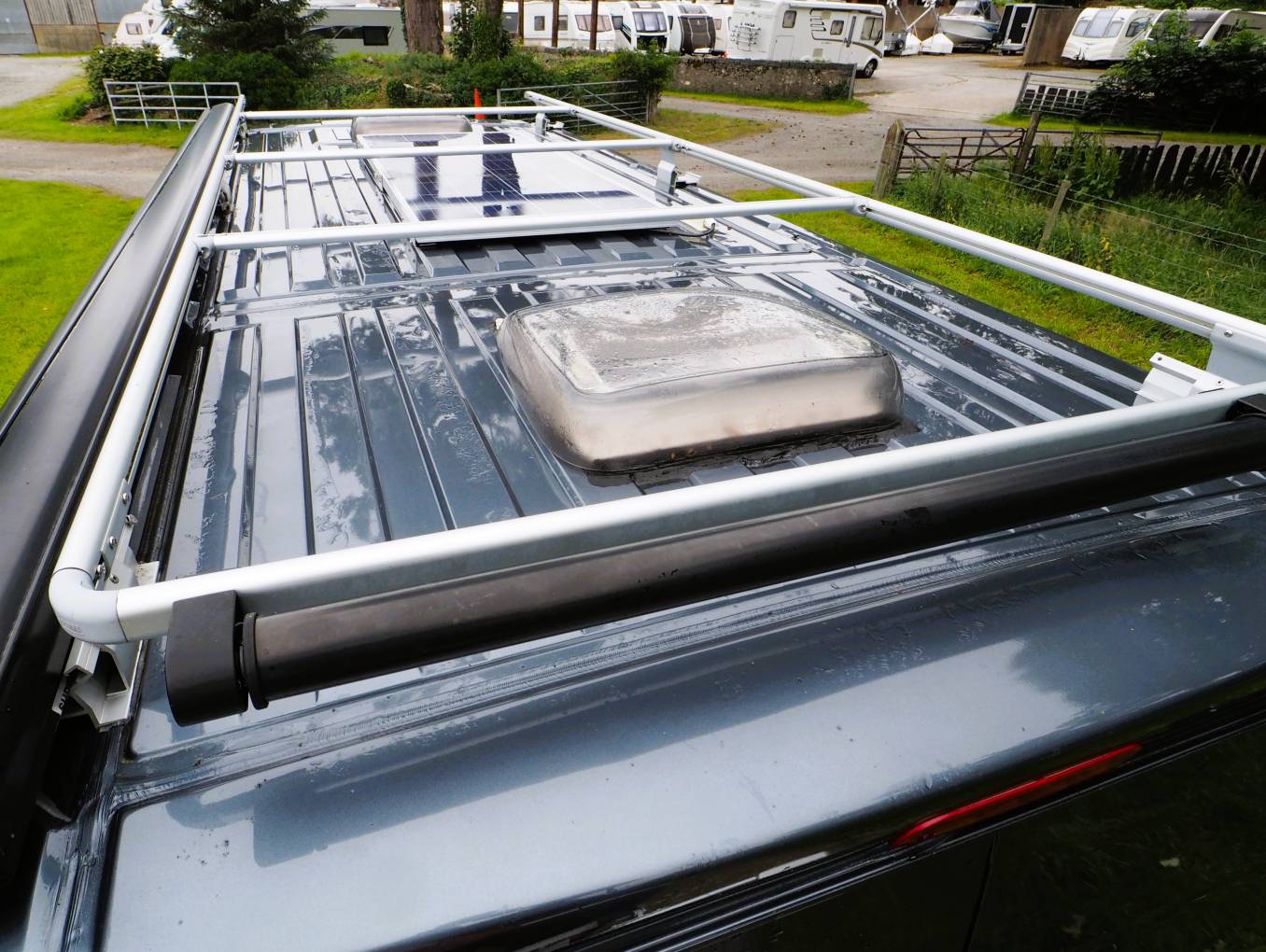 A tow bar is fitted to the rear with roof access to the roof mounted carrier with roll bar and suitable for kayaks, canoes and paddle board storage. Rear garage storage and easy access to all the service equipment with a door mounted shower and porta potti providing bathroom facilities. A 3m Dometic wind out sun canopy makes for a great outside space for al fresco dining and relaxing.