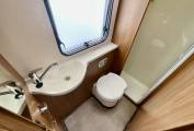 The rear washroom features shower cubicle, Thetford toilet with cassette, vanity unit and storage.