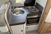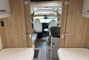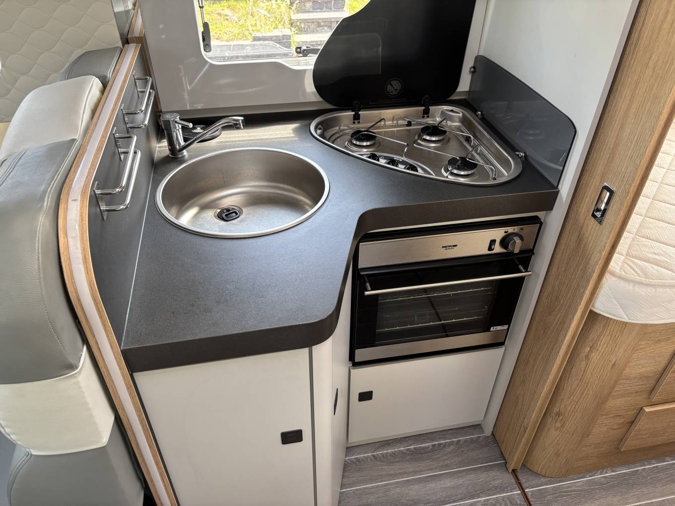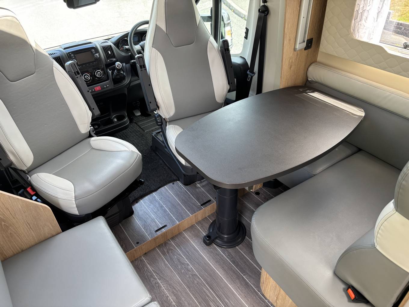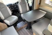 The centre kitchen is well equipped with a sink, oven, grill, three gas hobs, and a large fridge freezer, ideal for meal preparation whether you’re on-site or off-grid. Above the front dinette is a drop-down electronic double bed, and the dinette itself converts into a single bed, allowing sleeping space for up to five people. The two swivel cab seats further enhance the living space, creating a comfortable social and dining area.