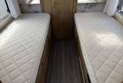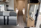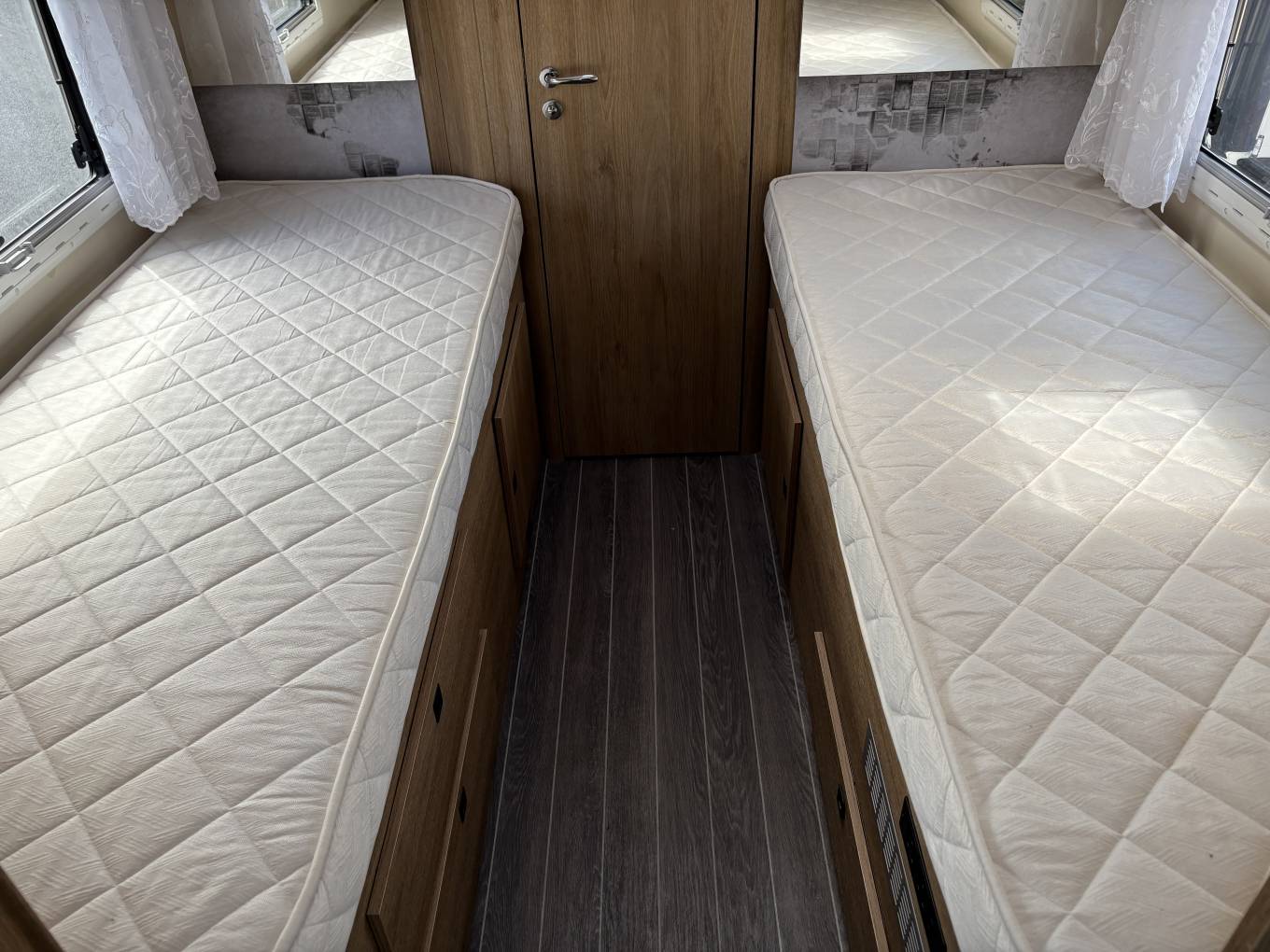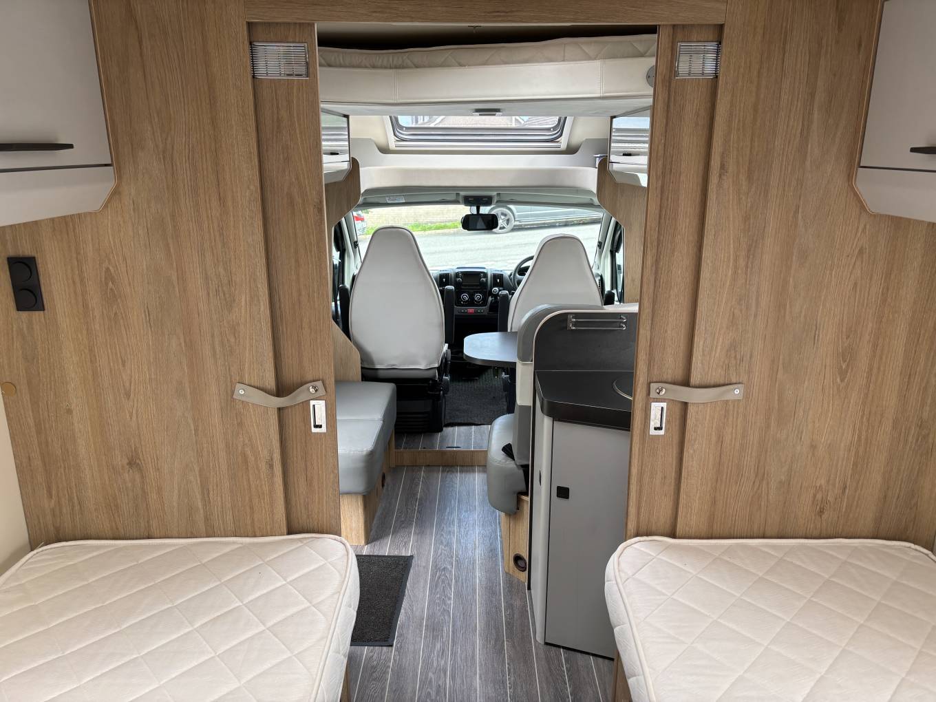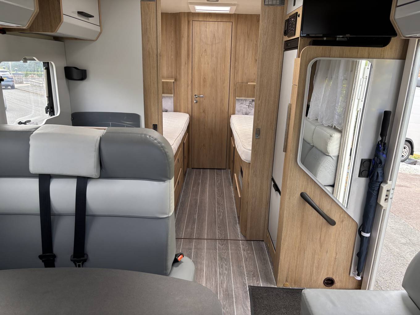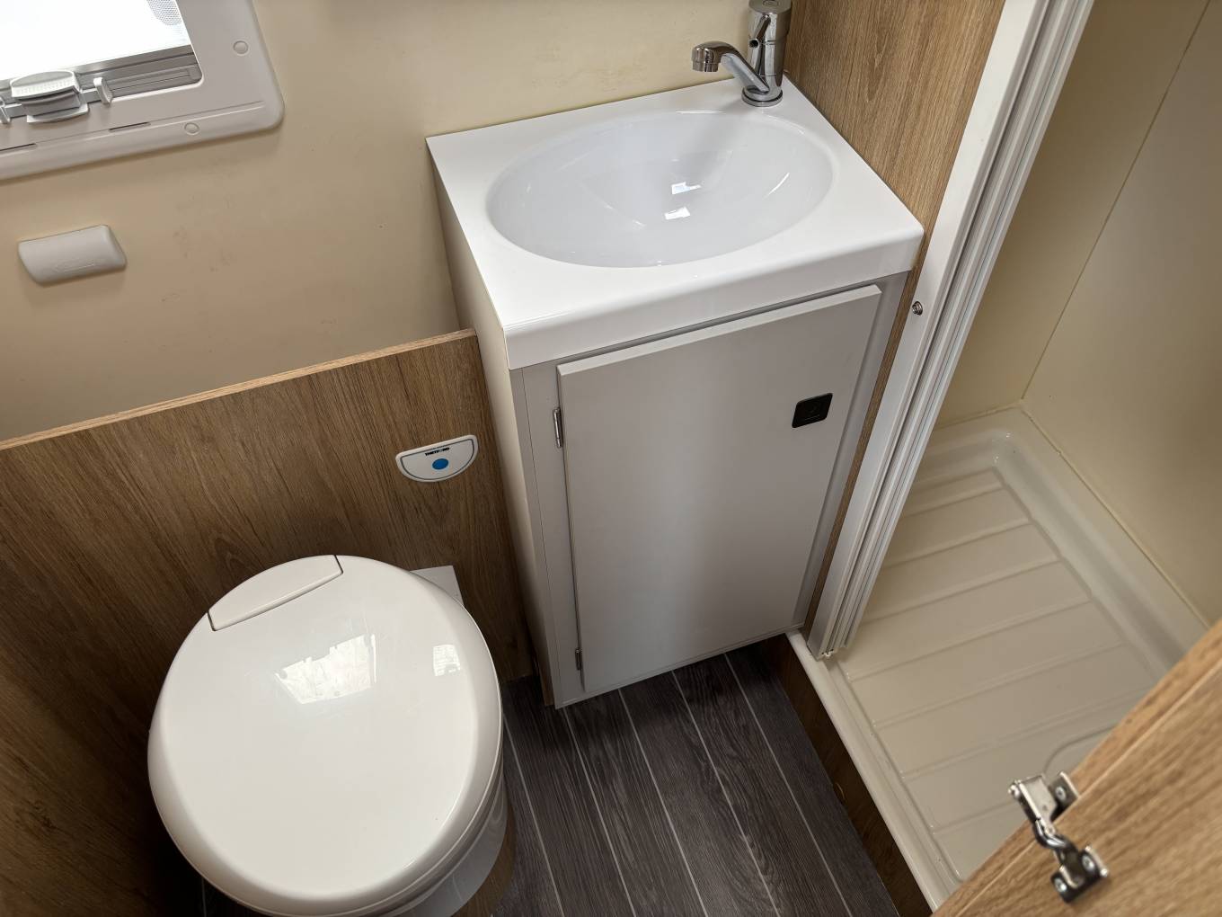 At the rear, the T-Line 785 offers two comfortable fixed single beds, perfect for those who prefer individual sleeping arrangements. To the very rear, you’ll find a spacious washroom with a toilet, sink, and a separate shower cubicle, offering excellent privacy and convenience.