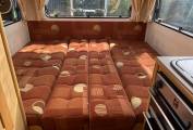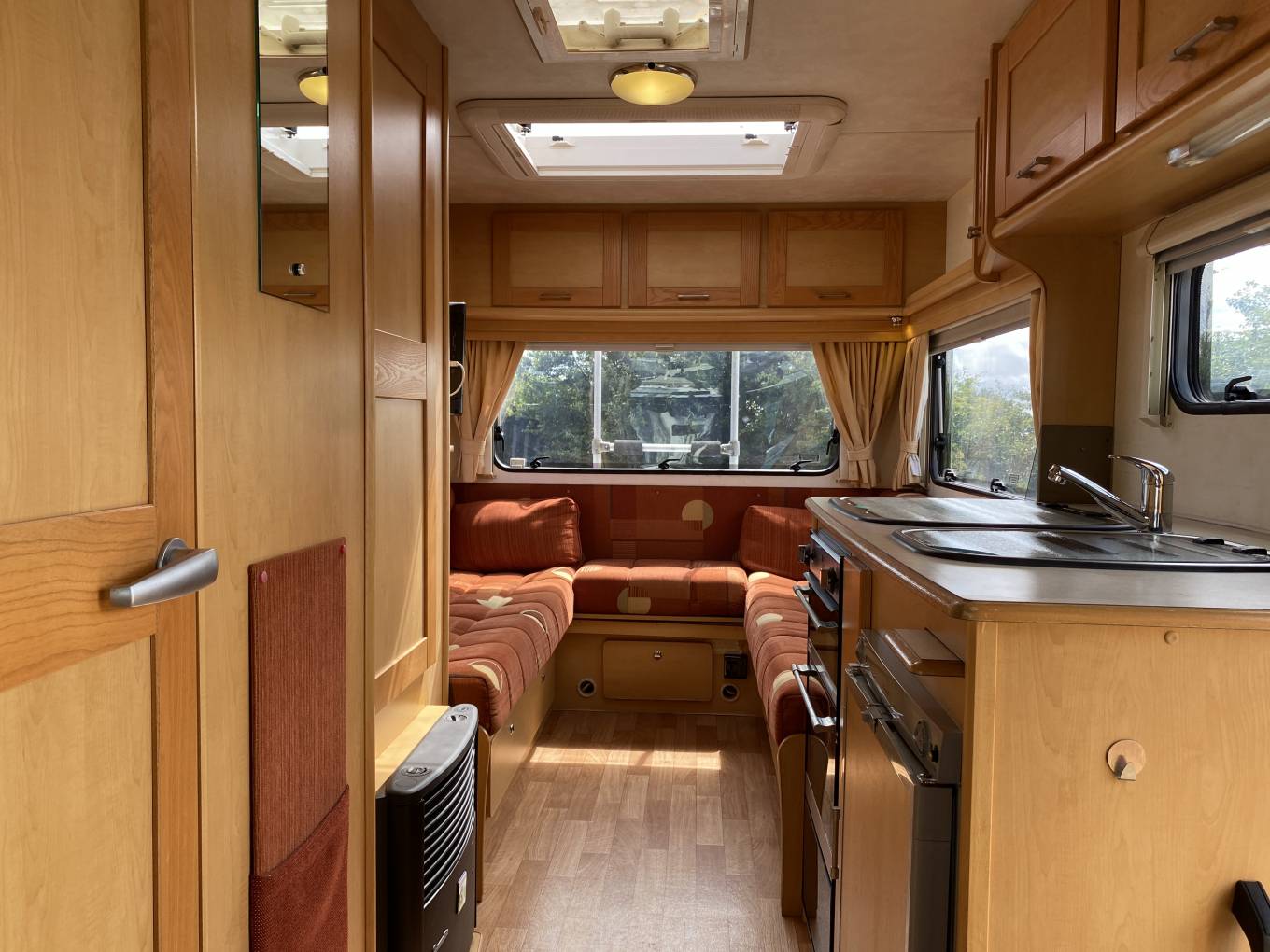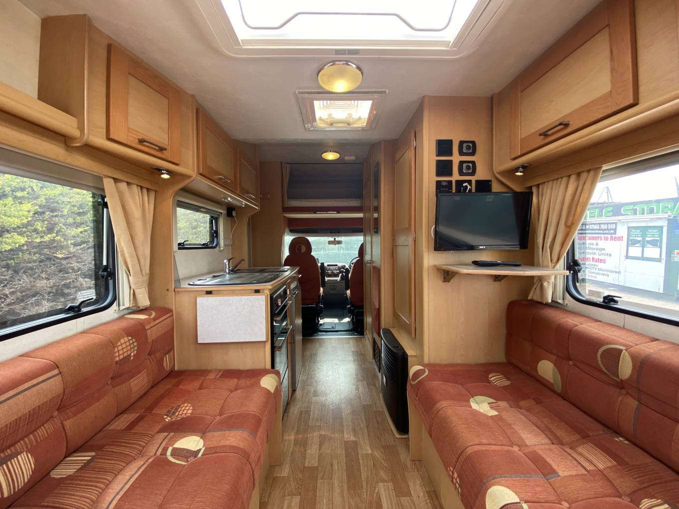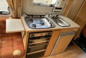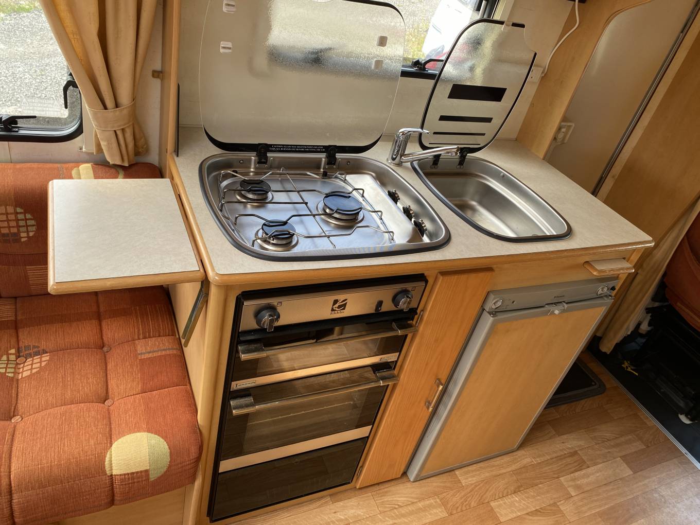 A well-equipped kitchen sits in the middle of the motorhome, complete with 2 gas and 1 electric hob, oven with grill, Dometic three-way fridge, sink with mixer tap, fold out preparation space and good storage.