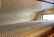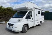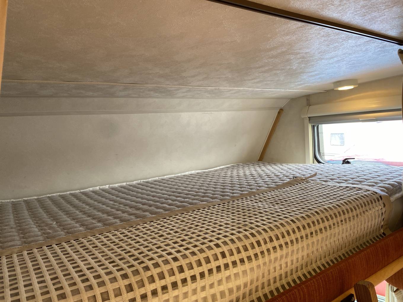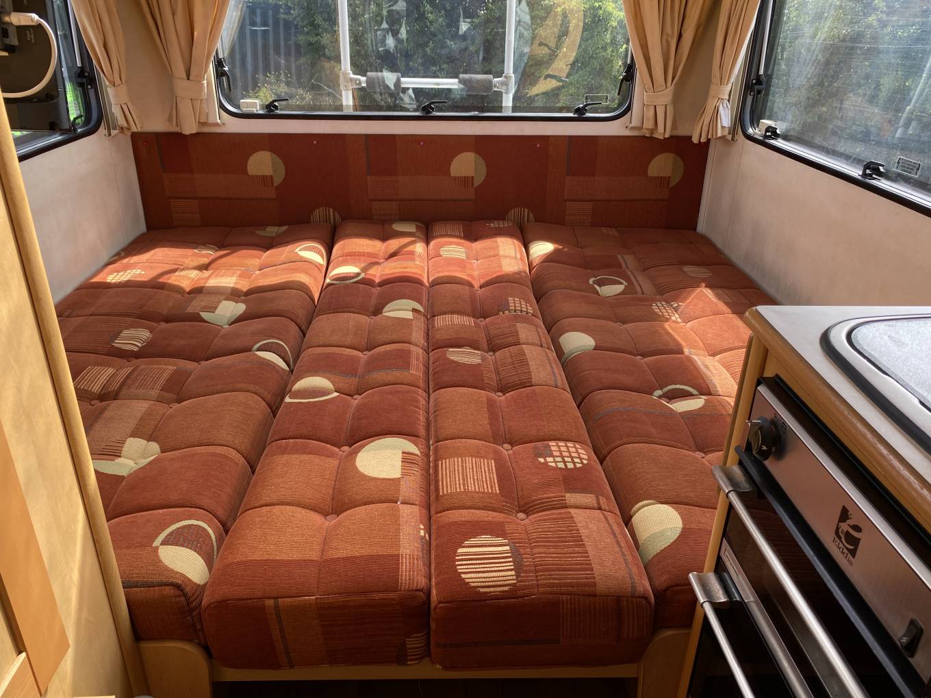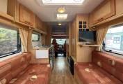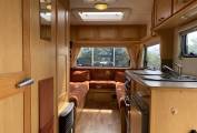 This 4 berth, 2 belted motorhome offers an above cab double bed and the popular rear lounge layout, complete with large windows and skylight to maximise natural light. At the rear of the motorhome, you could comfortably seat six, and a free-standing table completes the area for socialising and mealtimes. The rear lounge can be quickly made up into a double bed or used as singles. Good storage in overhead lockers a large wardrobe and under the seats. TV with the vehicle.