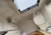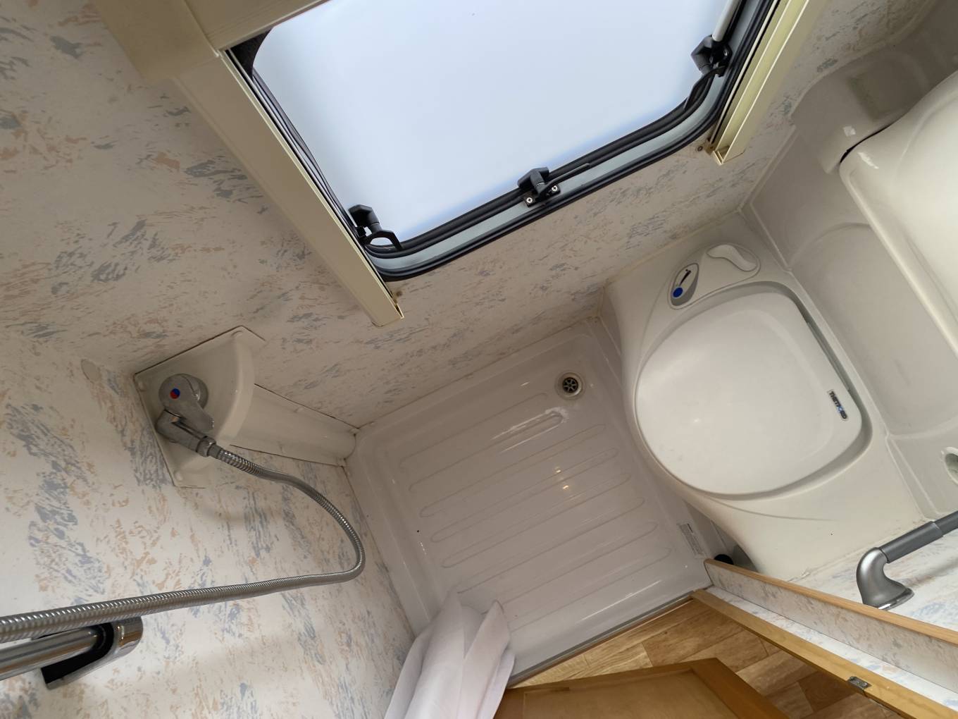 The spacious washroom comes with a shower, fold out washbasin, and cassette toilet.