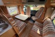 Mid habitation is the kitchen which is made up of 3 gas hobs, wash basin sink with hot and cold water, large 3-way fridge with freezer space, oven/grill combi and more storage. Finally, towards the front of the motorhome we have the spacious and light dinette area made from one forward facing bench and a side lounge seat. This area also houses two additional 3 point seats belts and can be made into a seating area easily big enough for 5 by swivelling the front driver and passenger seats to face into the living area. This area also makes a double bed.