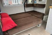 The L shape sofa in night mode, provides a French style double bed. In day mode, it can be configured to carry a further 3 people on a bench seat, with 1 full seatbelt and 2 lapbelts. There is plenty of storage surrounding and a TV.