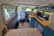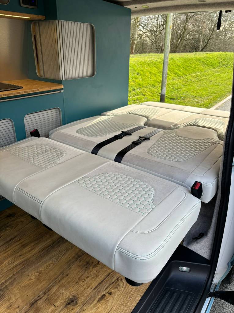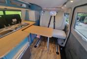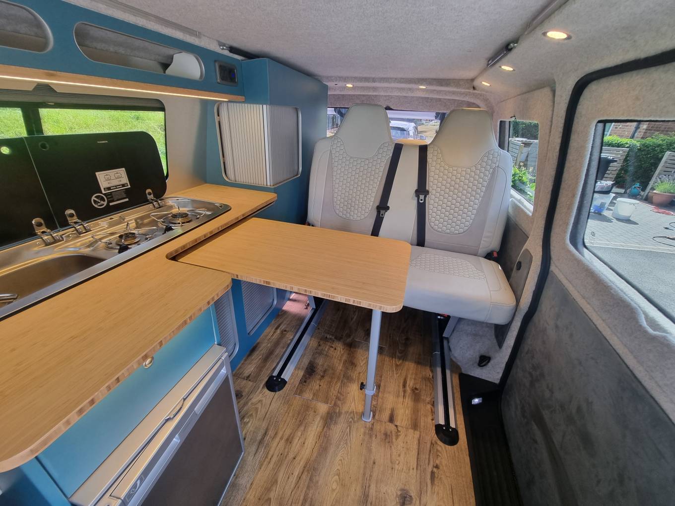 At the front, this van features a man made leather upholstered to slide forwards that turns to face the lounge. To keep the van warm a diesel heater is fitted. LED lighting are featured throughout the van, along with USB points and 240 sockets.