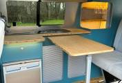 In the kitchen, there are two gas hobs with sink and bamboo worktops and an extended area with water pump and Dometic fridge/freezer, with plenty of storage for crockery, cutlery and more. There is overhead storage lockers to expand storage space.
