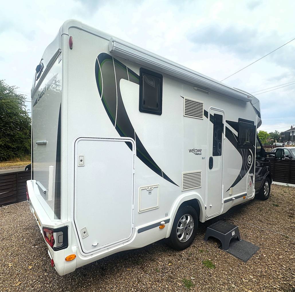 The motorhome comes with 4 travelling seat belts, a reversing camera, sat nav, Bluetooth, cab air con, cruise control, concertina front cab blinds, alarm and tracker, portable solar panel, TV, Aerial, wind-out awning, gas bottle, external gas and shower points and 240v hook-up cable.