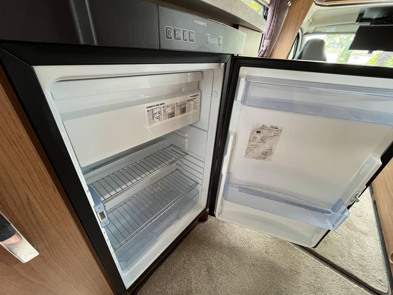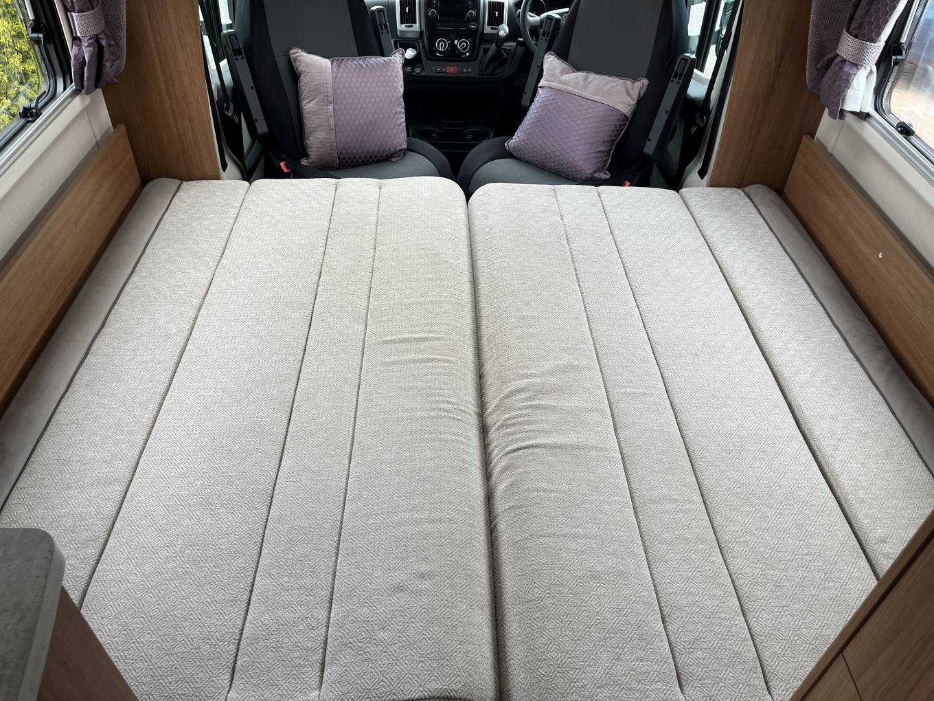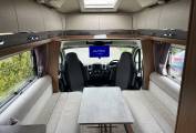 Creature comforts include Truma heating and hot water, LED lighting, and ample storage throughout, including overhead lockers and under-seat compartments. The cab comes with swivel captain’s chairs, air conditioning, cruise control, and a reversing camera.