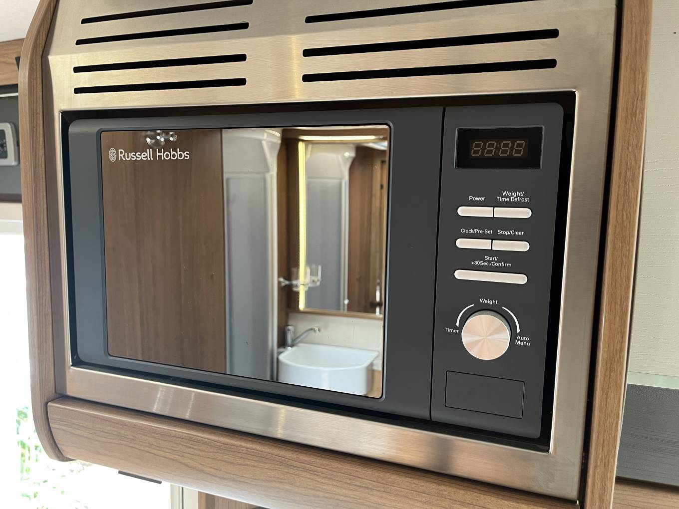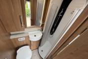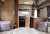 Inside, the layout is open and airy with a spacious front lounge featuring twin opposing settees that convert into a large double bed or two singles. The fully equipped end kitchen includes a duel fuel hob, oven, grill, microwave, and a three-way fridge. Adjacent is a spacious washroom with a cassette toilet, separate shower, and basin.