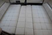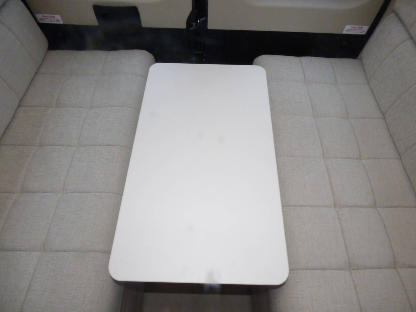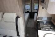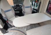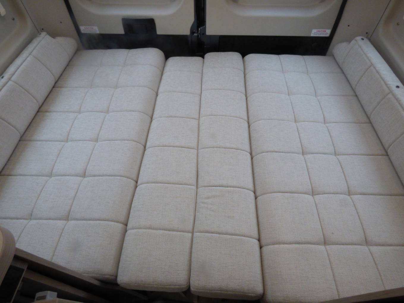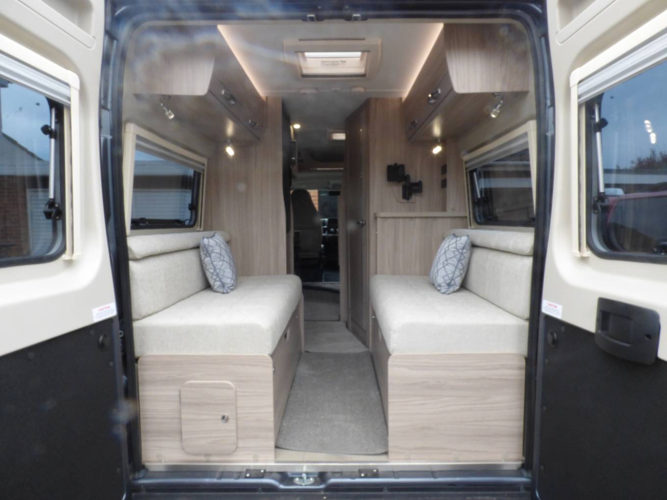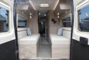 Internally the vehicle is light and airy with roof lights and has a front lounge area with extendable table and two swivel seats opposite the forward facing bench seat with the 2 extra seat belts. This seat converts to the extra berth. The rear lounge with 2 bench seats opposite forms a very cosy socialising area with collapsible table and quickly forms a large double by pulling the two seats together.