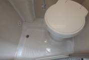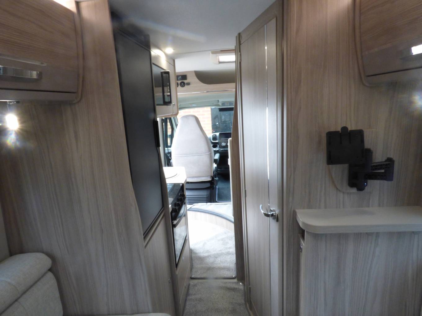 In between the two lounges can be found a well equipped kitchen - 3 ring hob, gas grill and oven, sink, extendable preparation area, microwave, large fridge with freezer compartment - and a washroom with full height shower, vanity unit and cassette w.c. The carpets are unused, the shower curtain is still in it's wrapper along with a mattress for the front berth. The vehicle is incredibly well equipped with individual lighting throughout and masses of storage space in overhead lockers and below the rear bench seats. The cab has a comprehensive media unit with bluetooth and Apple car play, cab blinds, cruise control and air conditioning.
