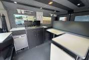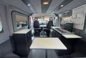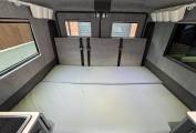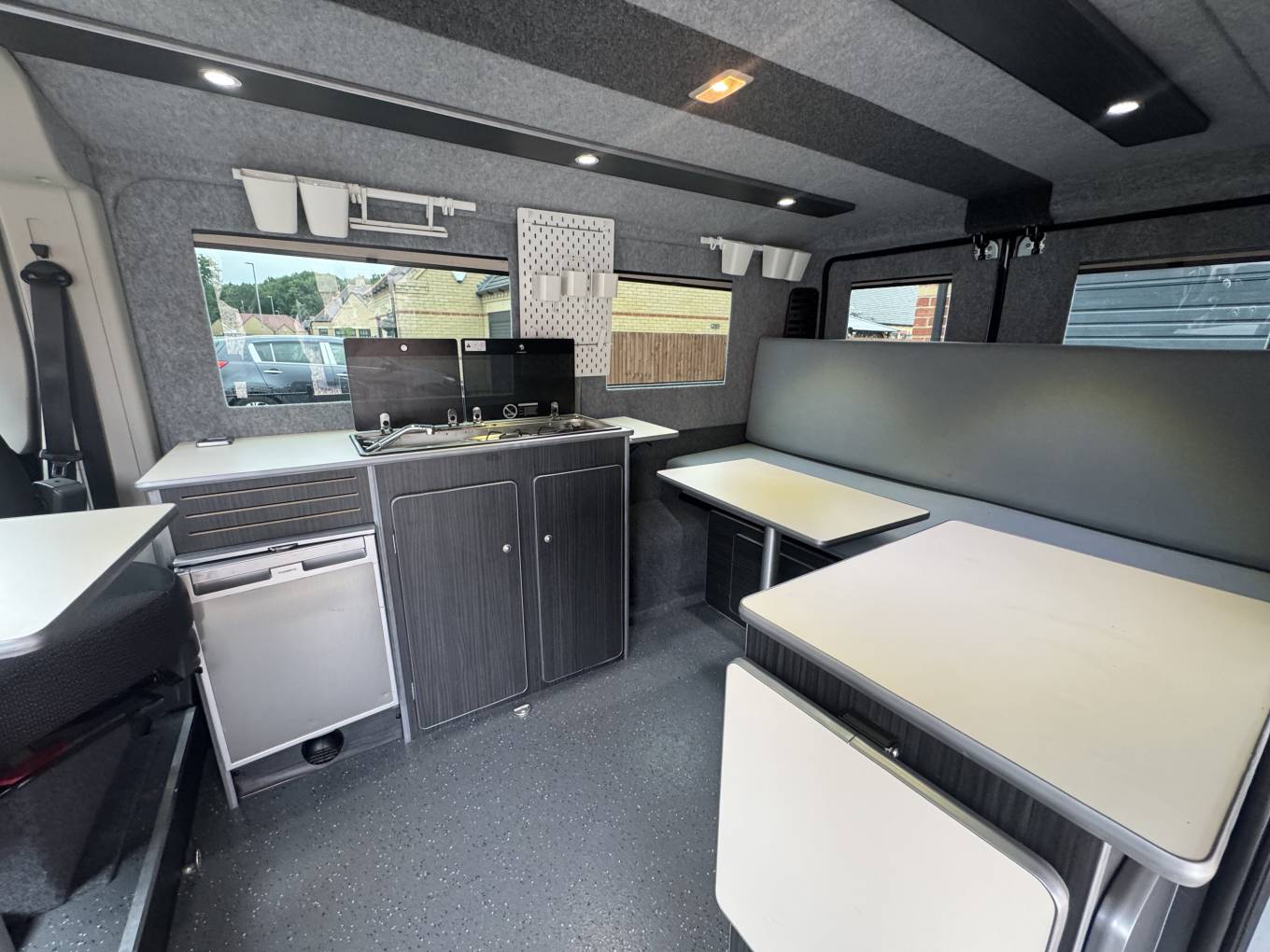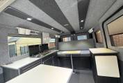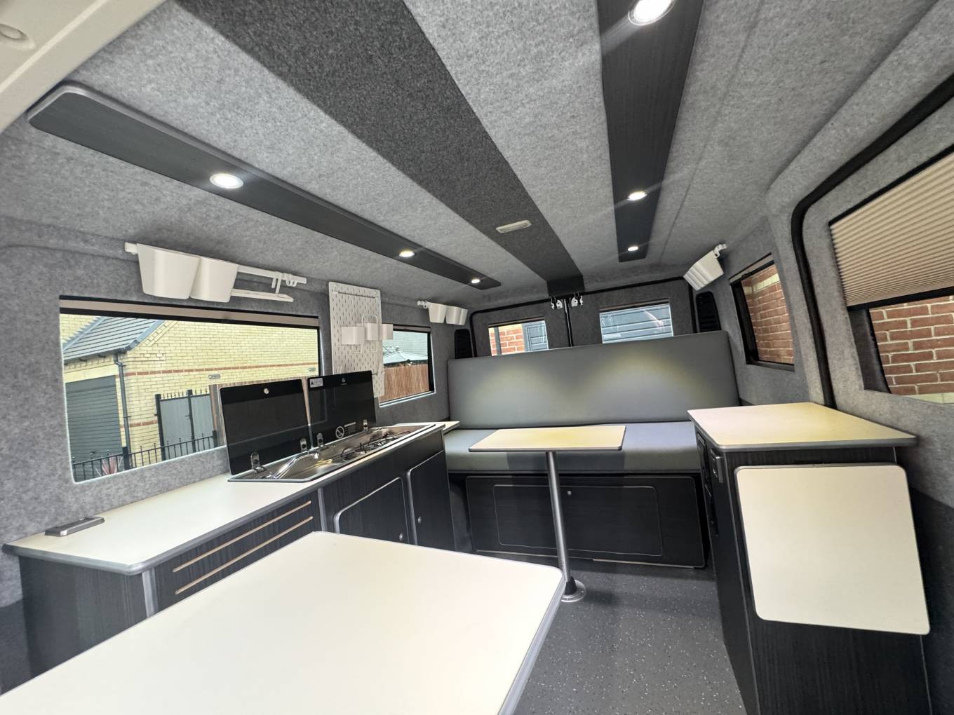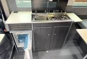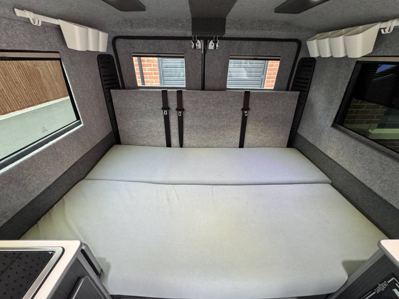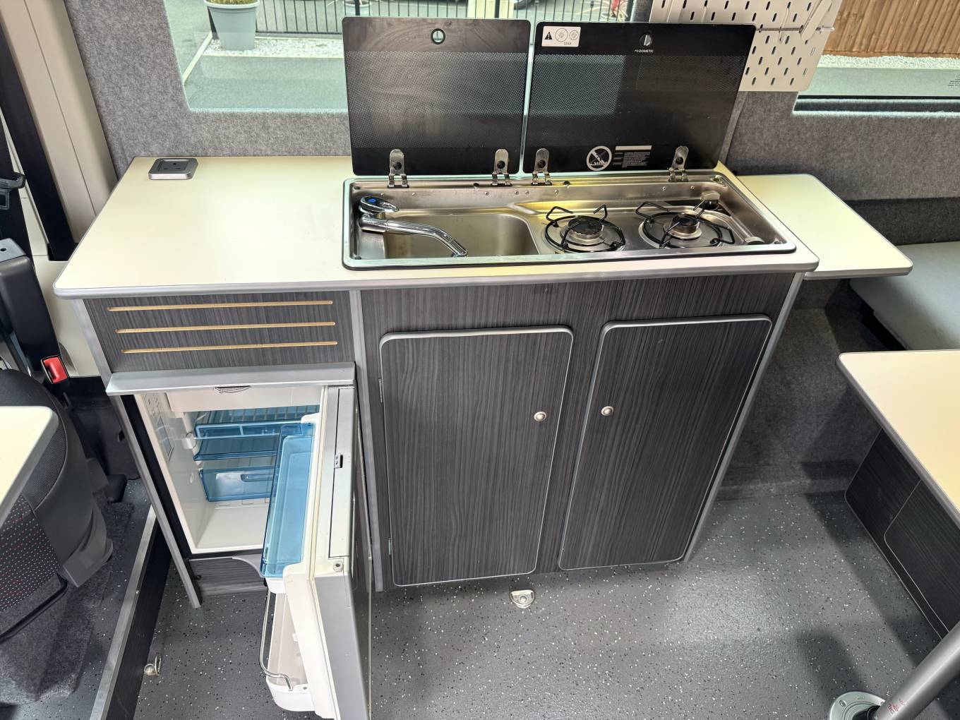 Inside, you’ll find five belted travelling seats and a neatly integrated rock ‘n’ roll bed with useful storage space underneath. The kitchen is fitted with a two-burner gas hob and a fridge, with a layout that favours open space and allows plenty of natural light to flow through from the surrounding windows. The design avoids an excess of overhead cupboards, giving the interior a bright and airy feel.