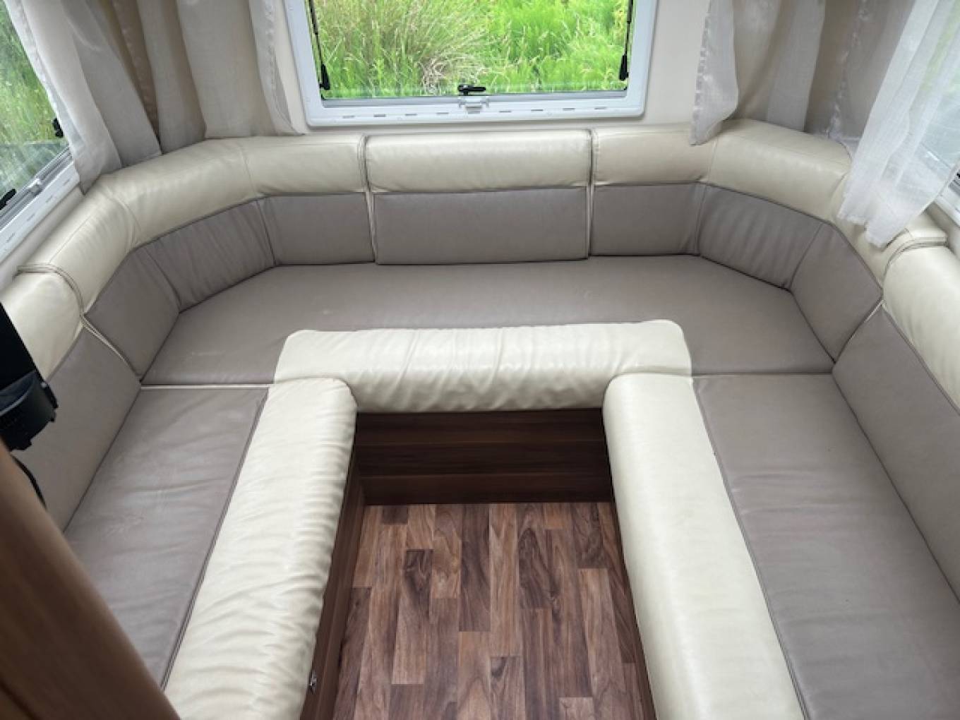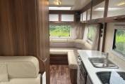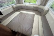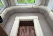 The spacious U shaped lounge is located at the rear of the vehicle with an additional living area at the front. The front living area has a layout of two double benches facing each other with the dinette in the middle. The forward facing bench has two seatbelts with the rear facing bench having one.