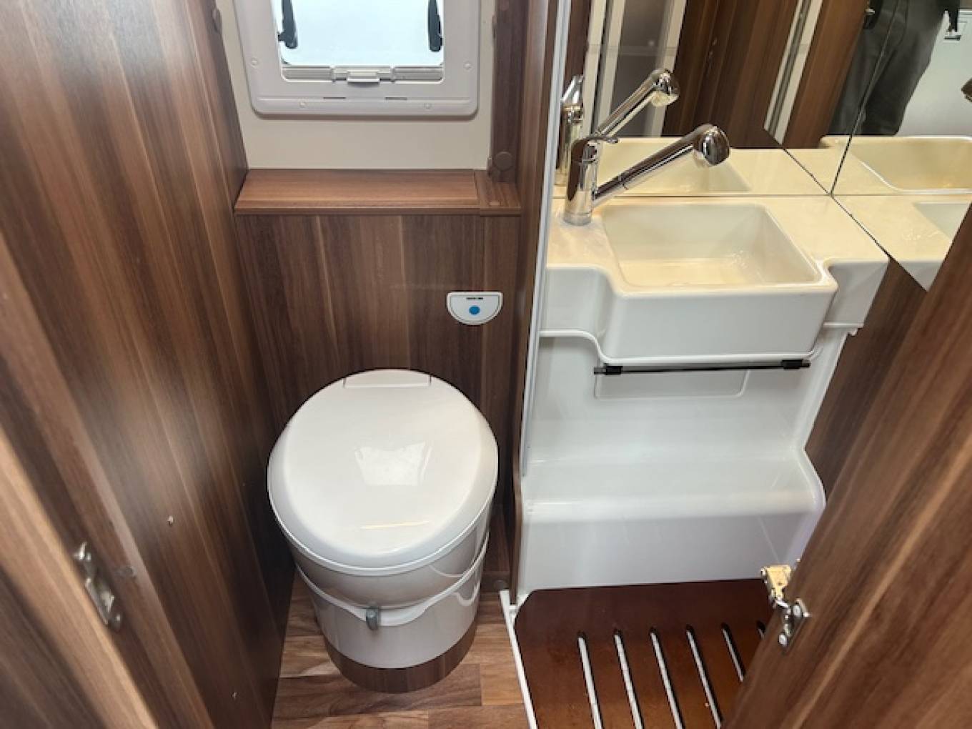The washroom is equipped with a Thetford swivelling cassette toilet, screened shower area, sink and storage space.