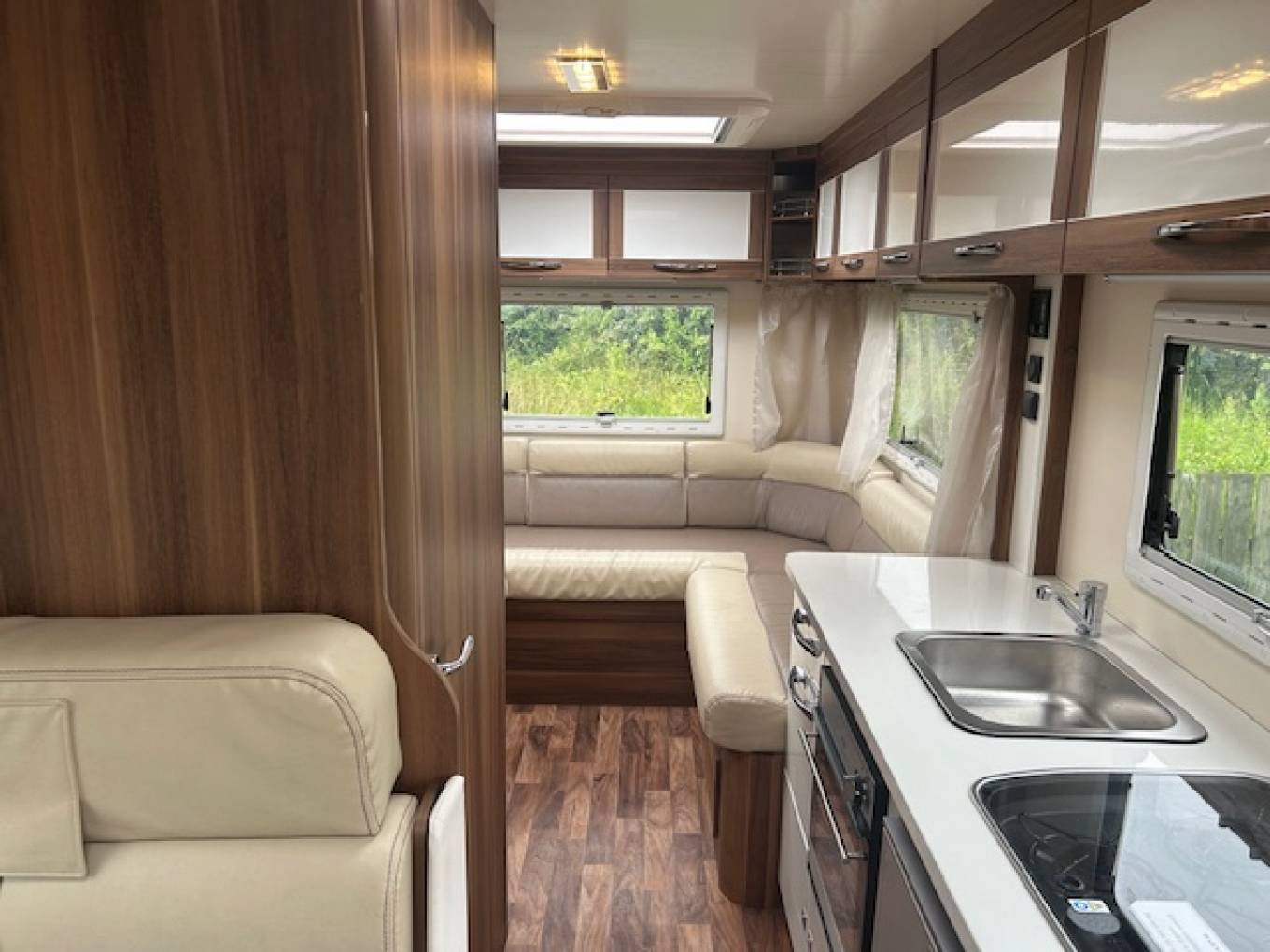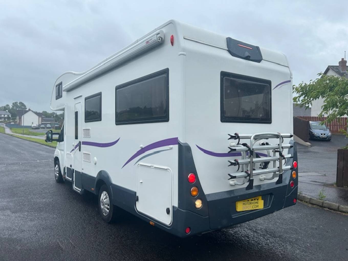 Additional features of this motorhome include a large garage, Truma Inet box, tracker, TV, bike rack and the motorhome is stored inside over winter.