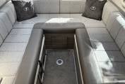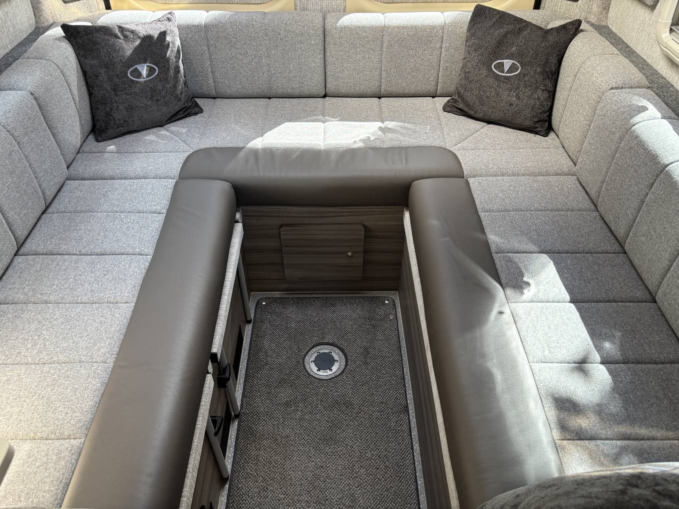 At the rear, you'll find a spacious U-shaped lounge which easily converts into a generous double bed. The area includes a detachable dining table, making it ideal for relaxing or entertaining. Two swivel cab seats at the front add flexibility to the living space and come with a smaller side table for added convenience.