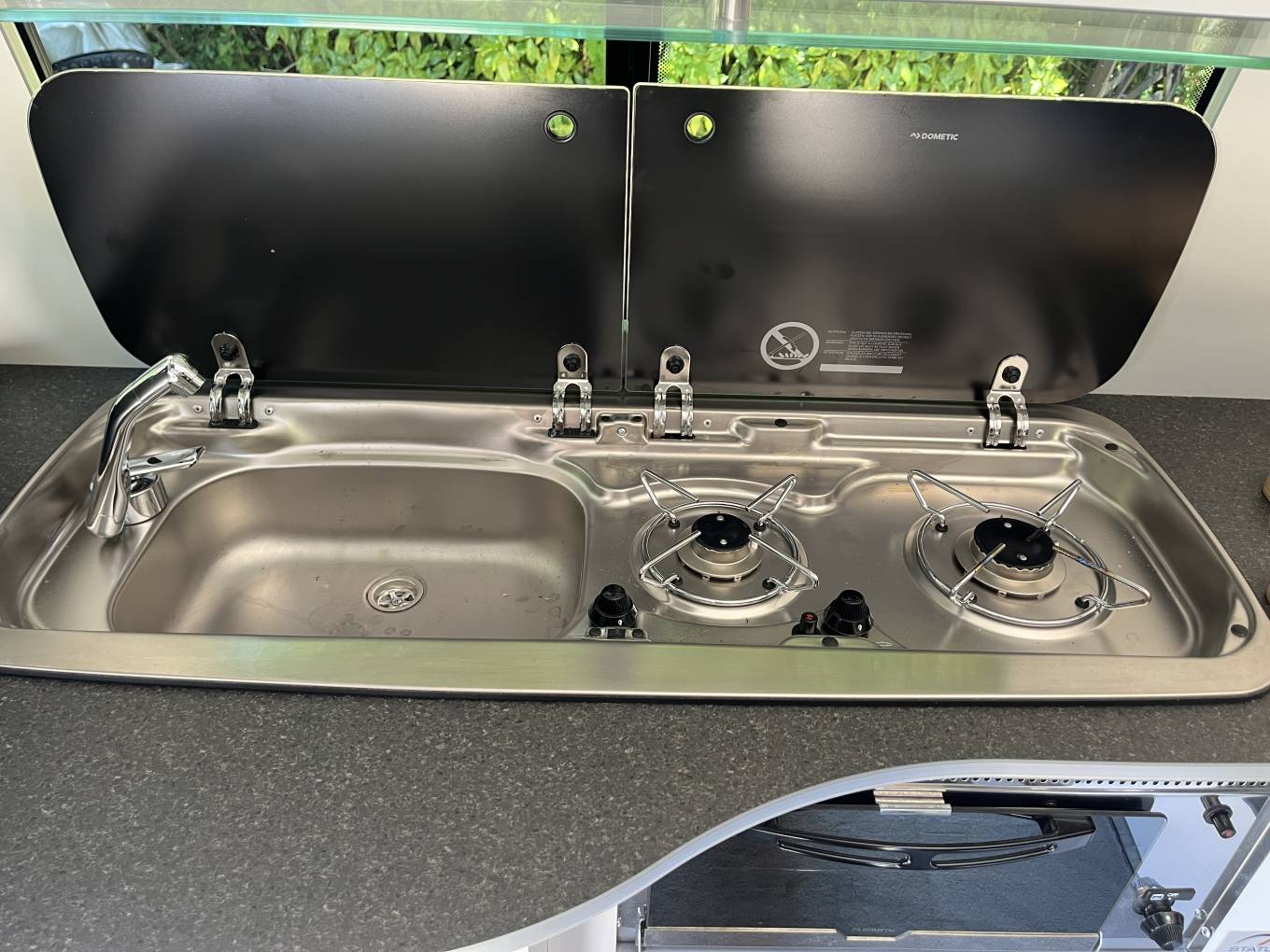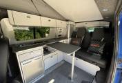 Inside, the Aurora offers a fully equipped kitchenette with a two-burner gas stove, grill, sink, fridge, and ample storage space. The rock-and-roll bed quickly transforms the rear seating into a cozy double bed, while a pop-top roof provides additional headroom and optional sleeping space above. Swivel front heated seats, LED lighting, and integrated blackout blinds enhance comfort and usability.