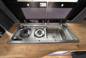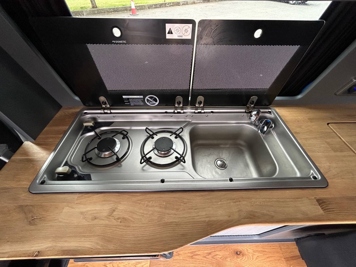 The kitchen is fully equipped with a 2-burner gas hob, sink with electric water pump, and a fridge/freezer with a good work space. Lots of storage space throughout.