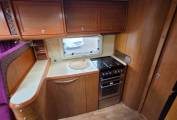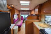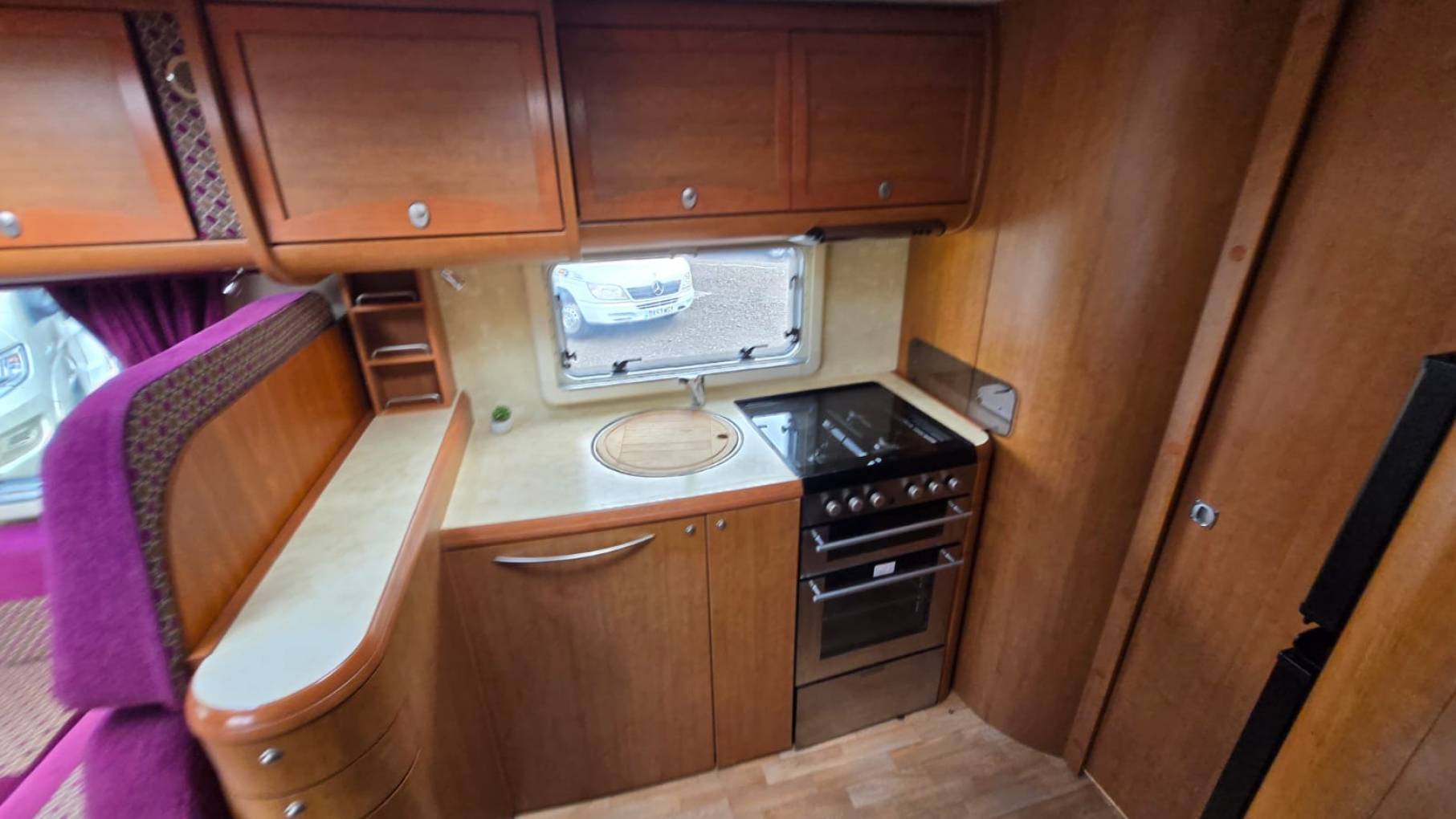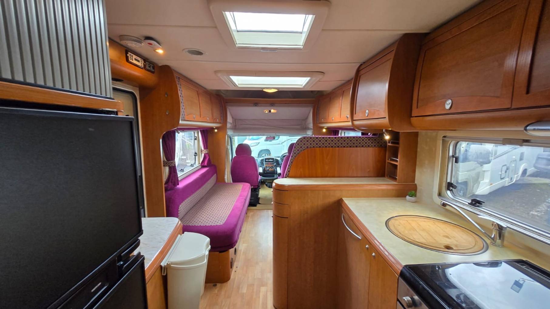 The habitation door with electric step gives you access to the middle of the motorhome, immediately to the right is a TV point and combination of storage cupboards incorporating a Visionplus aerial. There is A full size 3-way fridge with large separate freezer which can be powered by 240v; 12v or gas and above the fridge is the TV cupboard with tambor door.