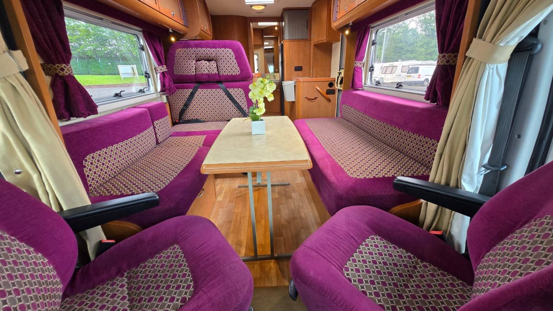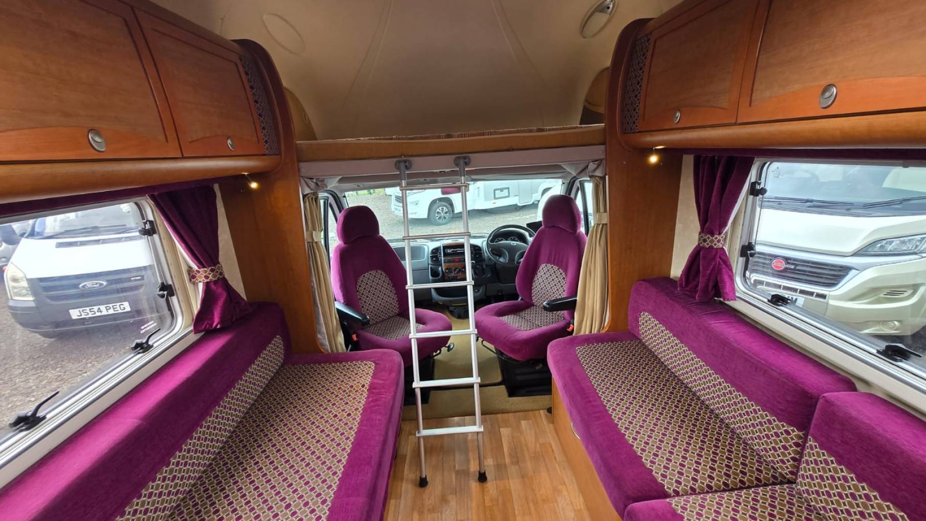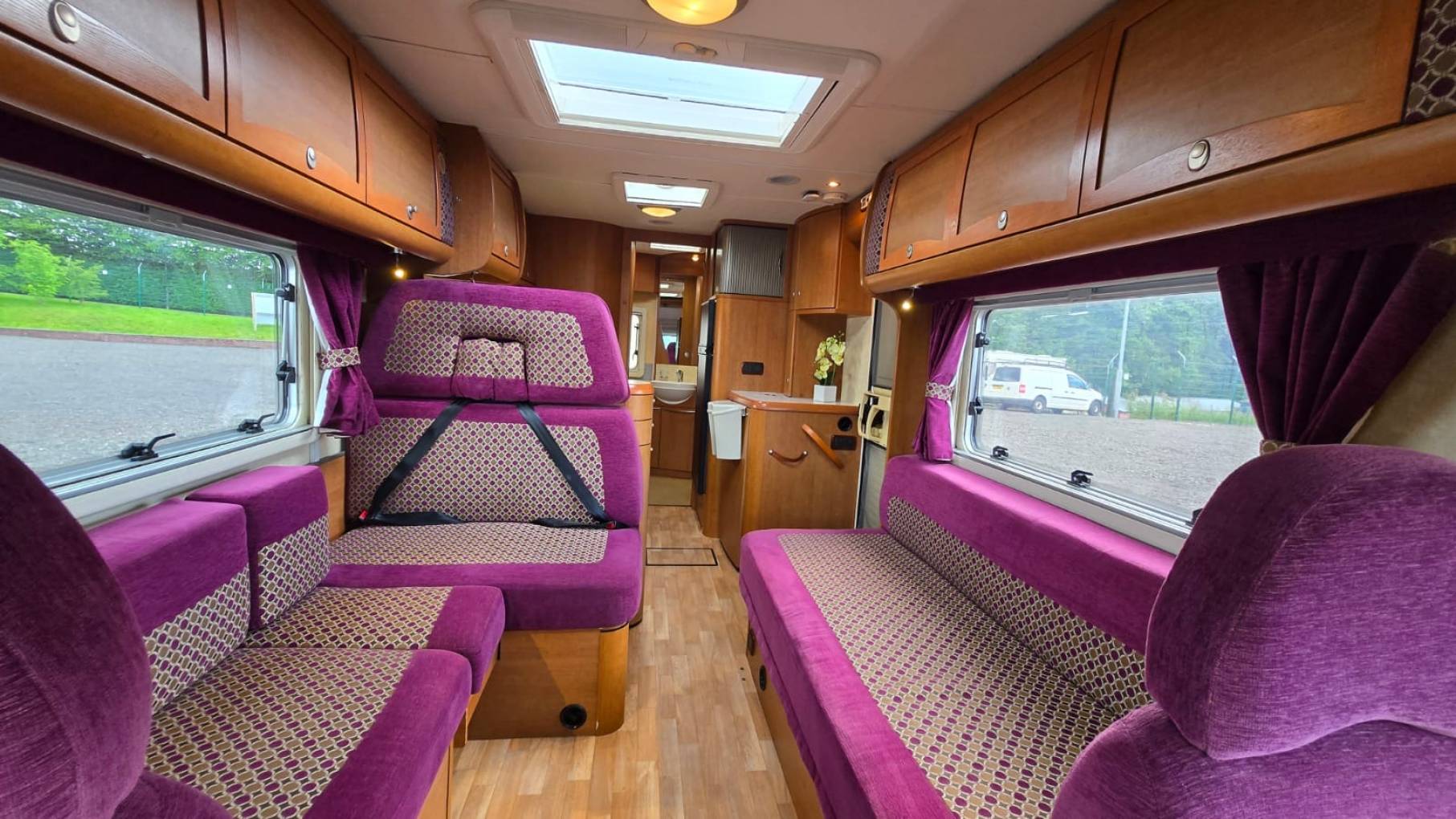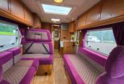 The layout is from the very front you have an over the Cab large spacious double bed accessed by a removable ladder, whilst not in use the base lifts to make access into the cab easier. Further back you then have the roomy and generous lounge area which is made up of a long sofa on the passenger side and a large L shaped sofa on the driver’s side which can be reconfigured into 2 travelling seats when on the move and either a full width double bed or a small double and separate single. There is a removable table that stows in the rear wardrobe. You could easily seat 6/7people around if entertaining on site.