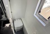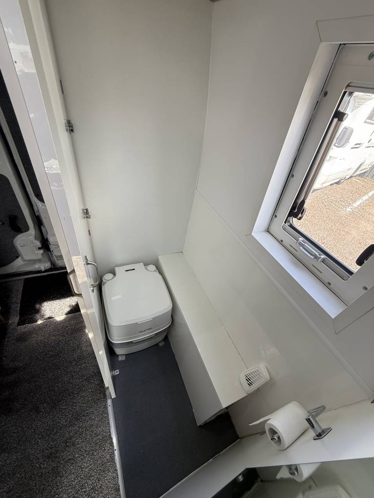 The layout is as you enter from the side habitation door you have facing you a long bench seat that easily folds over at night to make a double bed. This area has an island free standing table for when dining or relaxing. To the right you have a 2 gas burner hob with a sink with clean and wastewater storage containers hidden underneath. Across from the kitchen area you have a fridge powered by mains 240v and 12v and a TV installed on a wall bracket with a Visonplus aerial that also works on 12v and 240v. To the rear at the right you have a toilet room with sliding door fitted with a Porta Potti and there is plenty of storage space and lockers around with 240v mains plugs and 12v points installed