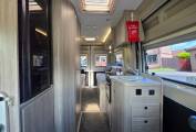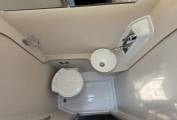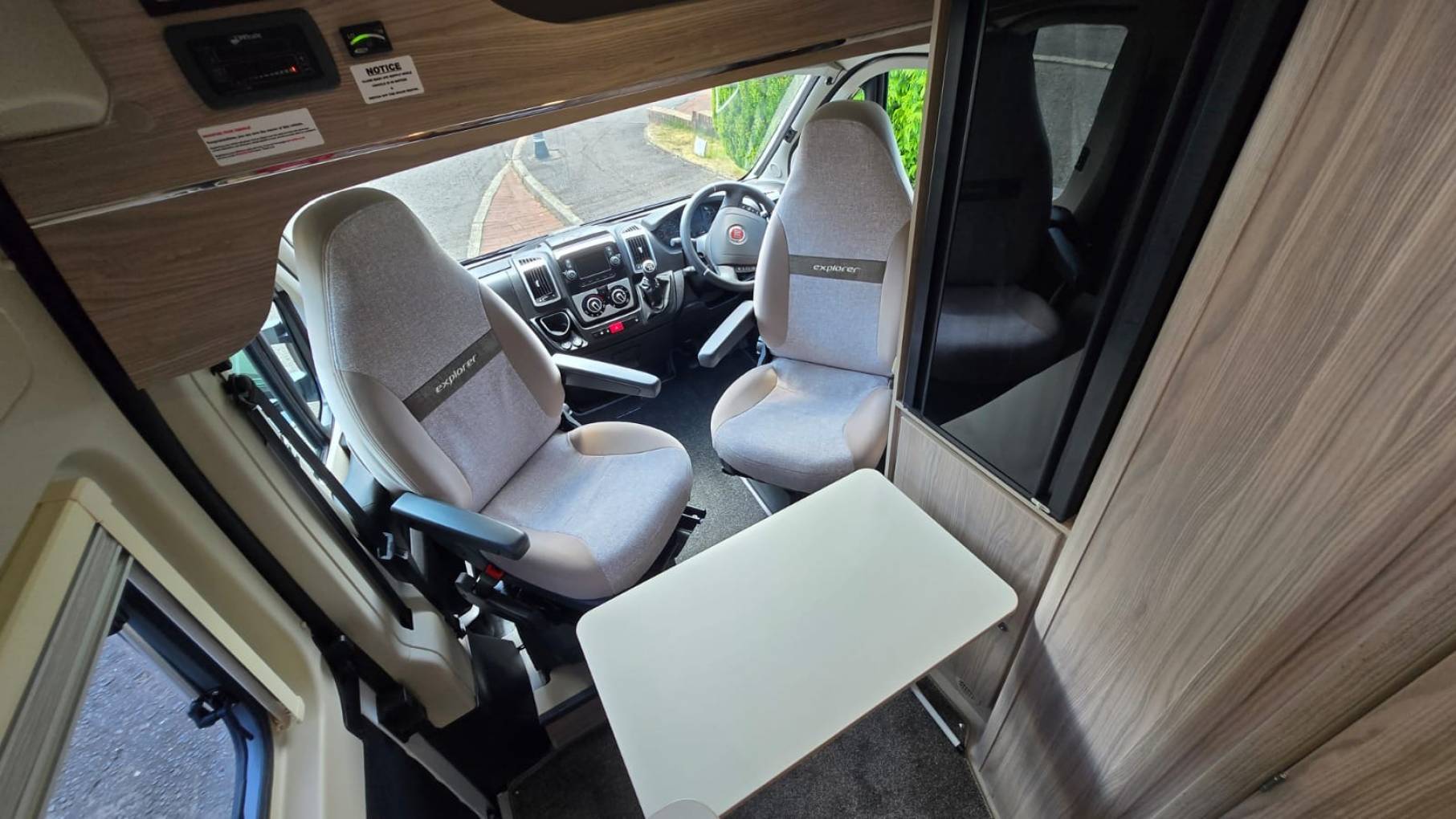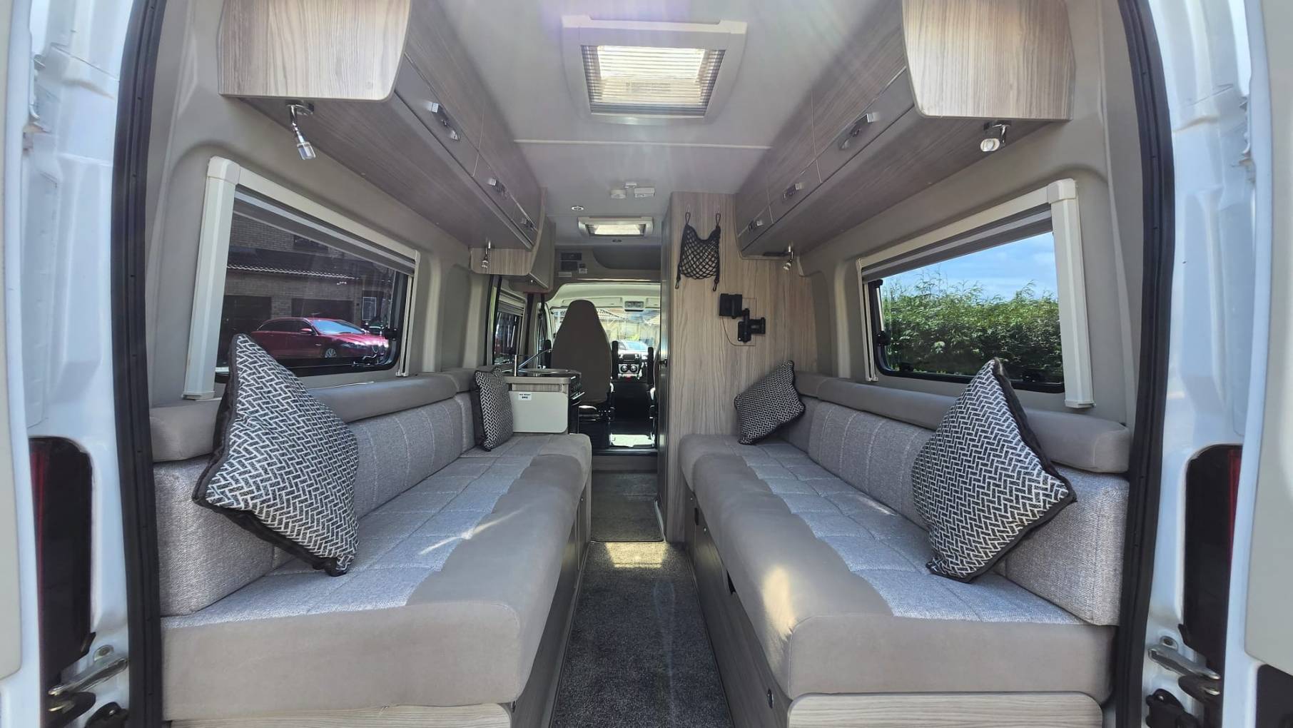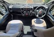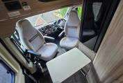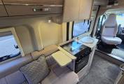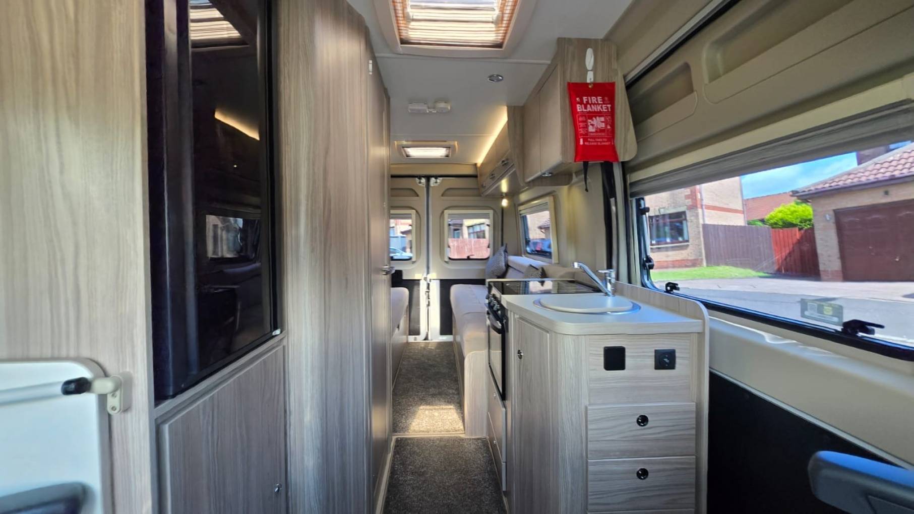From the rear you have the light and modern lounge which features two long bench seats that can be converted into either twin single beds or a large double bed, large side windows and a skylight flood the space with natural light enhancing the open feel of the interior. The fully equipped kitchen comes with a 3 gas hob, oven, grill, sink, and a fridge/freezer with a fold out shelf to give more workspace. A compact yet well-appointed bathroom includes a shower, cassette toilet, and sink. And at the front both cab seats swivel to allow people to dine and relax in comfort with a retractable fold away table available.
