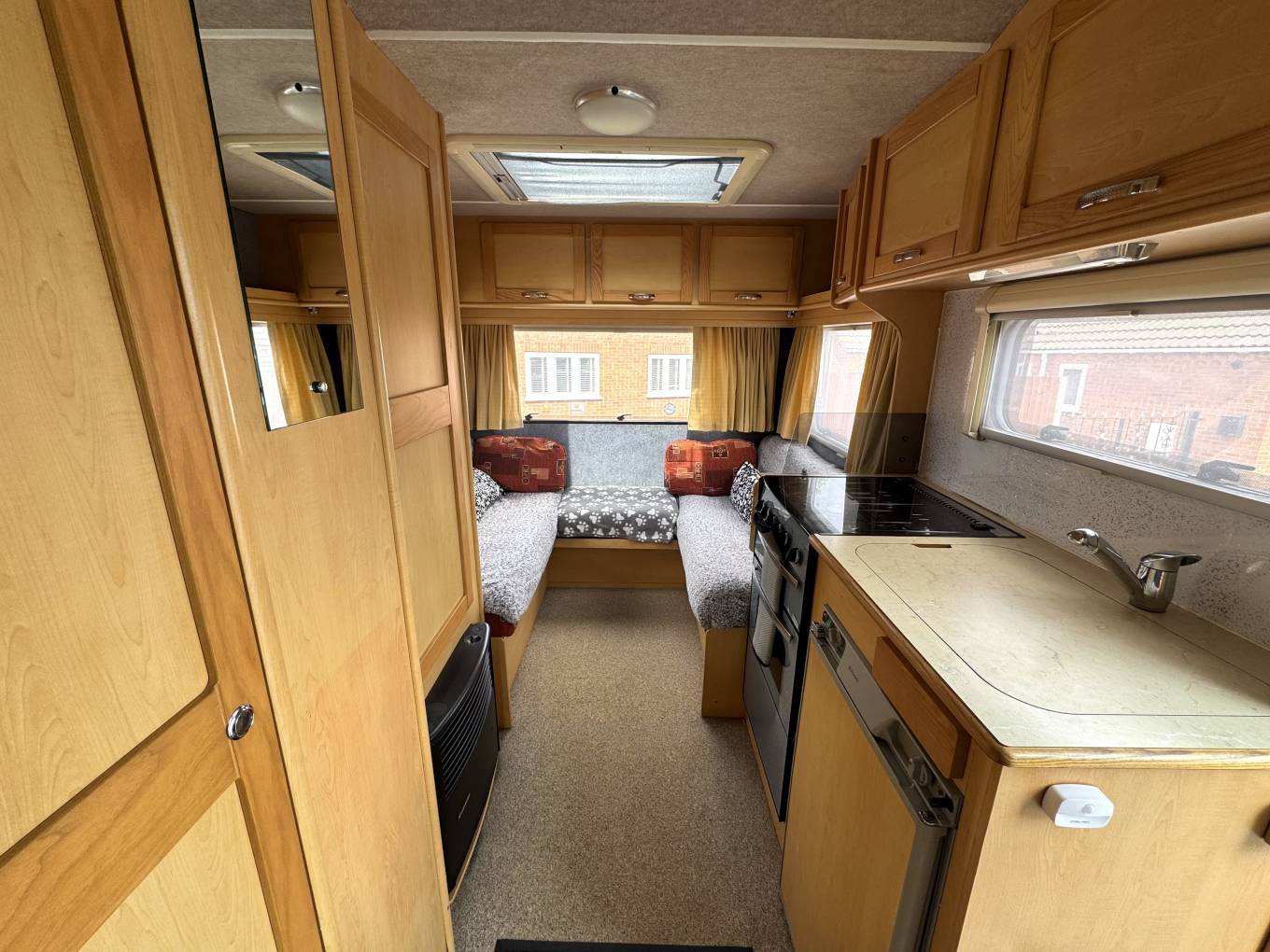 The centrally located kitchen is fitted with a hob, grill, oven, and a fridge, with useful storage options to keep essentials organised. Opposite the kitchen is the washroom, which includes a toilet, wash basin and shower. Heating and hot water systems are onboard, helping to provide a comfortable environment throughout your stay.