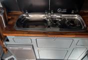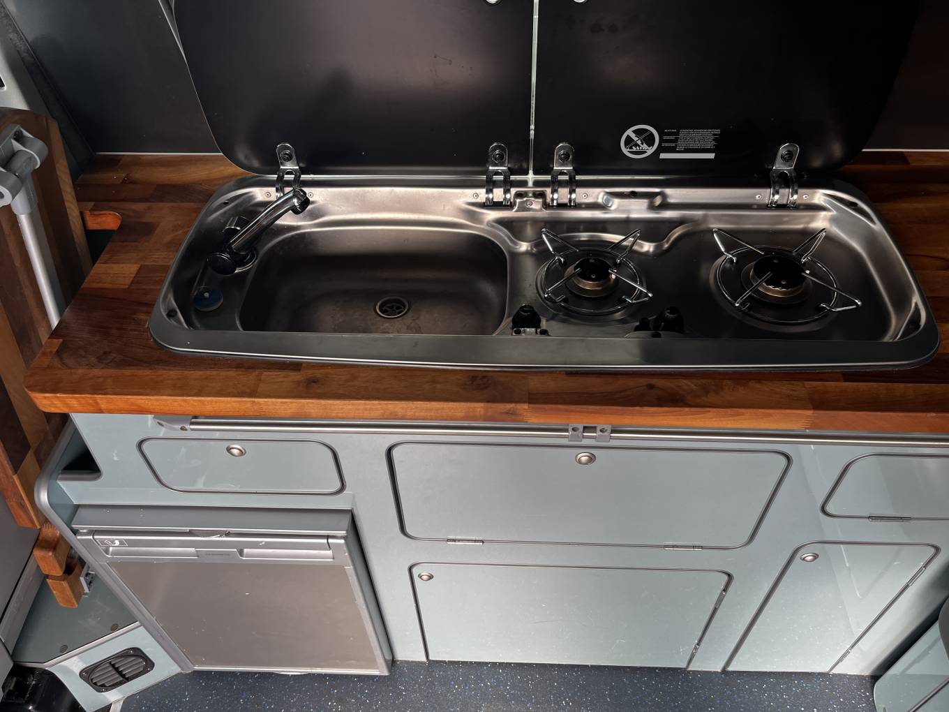 Kitchen - Hob with 2x gas rings – Sink with cold running water -- underslung fresh water tank – 12v Fridge with freezer compartment. Gas canister located in secure locker.