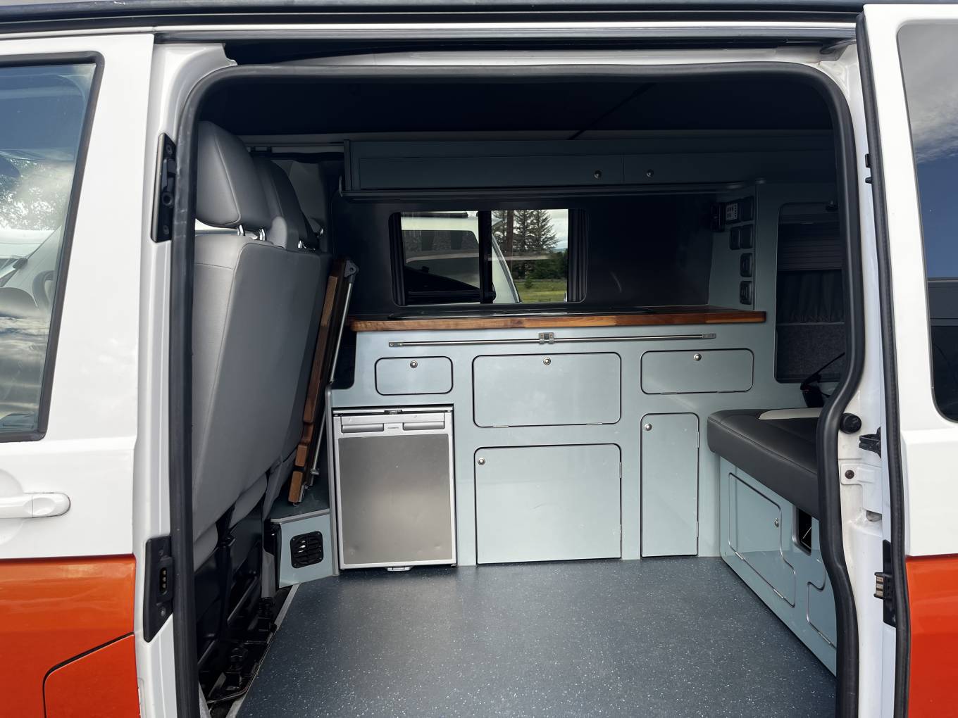 This Caledonian Campers conversion based on a VW T5.1 T28 base in Two-tone White over Orange. 4 berths comprised of the pop top roof bed, and the rock and roll fold down bed, . Extras include Roof rack, Bike rack, Gas bottle, levelling ramps and Electric hook up cable.