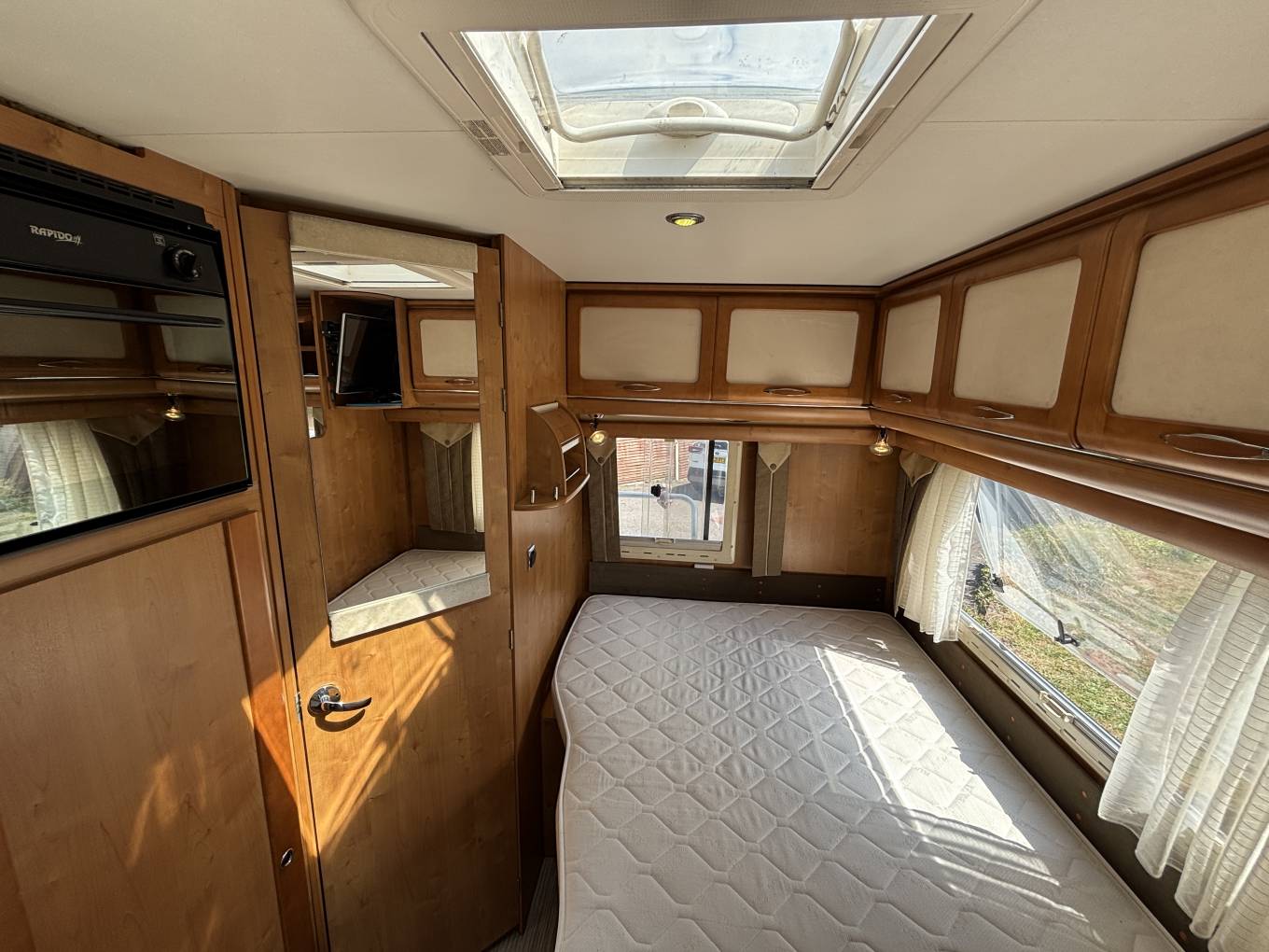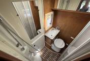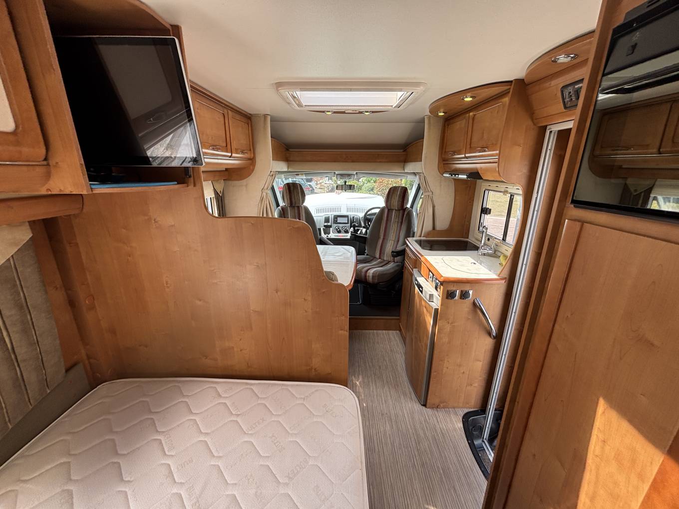 To the very rear of the motorhome is the ever popular French bed with understorage that can also be accessed from an outside locker. There is also eye level storage and a TV at the foot end of the bed.