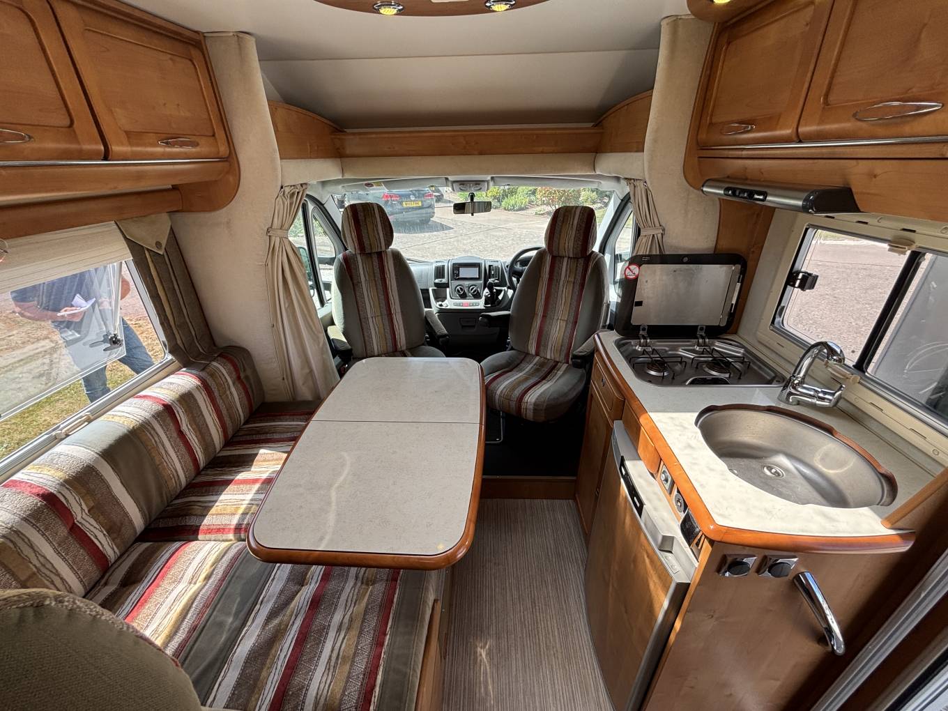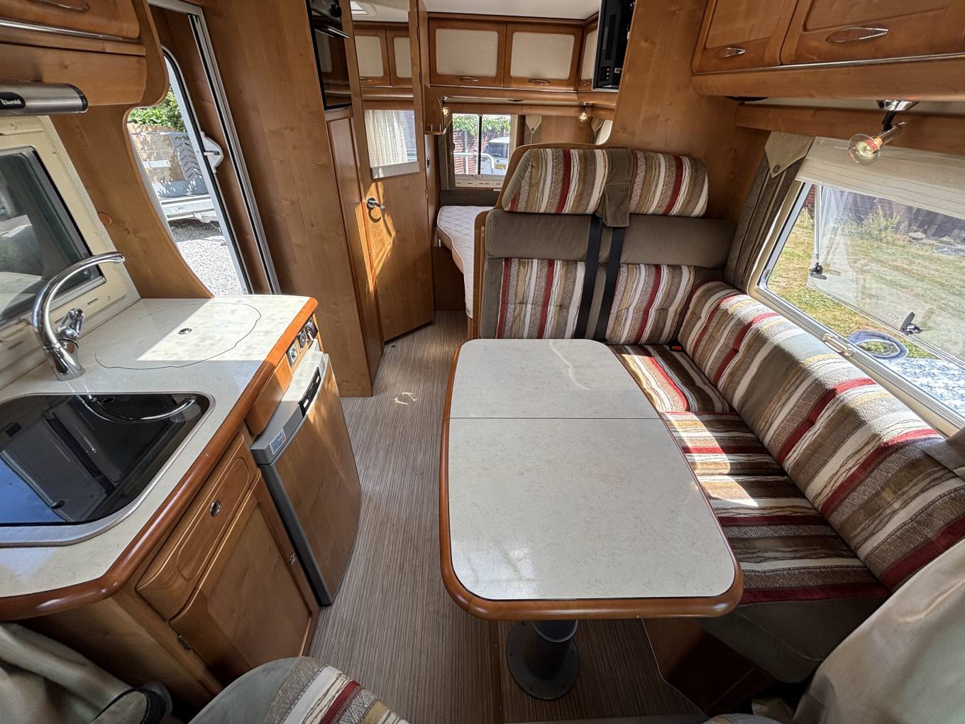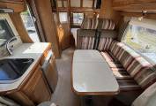 Opposite the dinette is the kitchen area which has a 2 ring gas hob, sink, 3-way fridge with freezer space, an oven, sink with mixer tap and storage at eye level and also under counter.