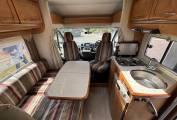 As you enter the habitation door on the drivers side of the motorhome, the dining and seating area is to the far side towards the front of the motorhome. This spacious dinette with the movable fixed table has the added benefit from the swiveling front driver and passenger seats for a generous relaxation area. This area can also be converted to an extra bed if required and has eye level storage above.