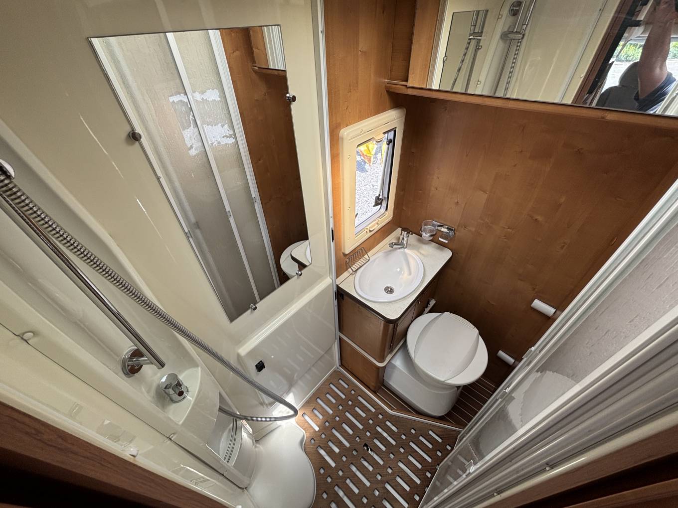 To the opposite side is the washroom with shower, toilet and washbasin.