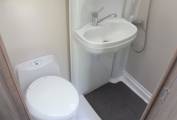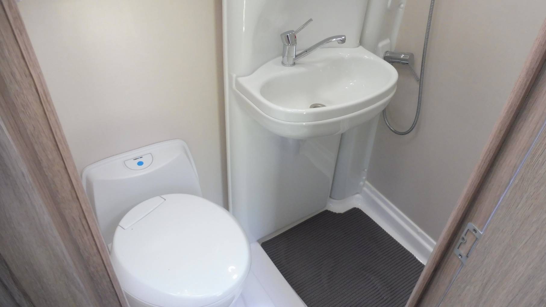 The washroom is a good size and offers a separate shower cubicle with shower screen, a Thetford cassette toilet with electric flush, a washbasin with chrome mixer tap and there are storage cupboards and a mirror.
