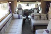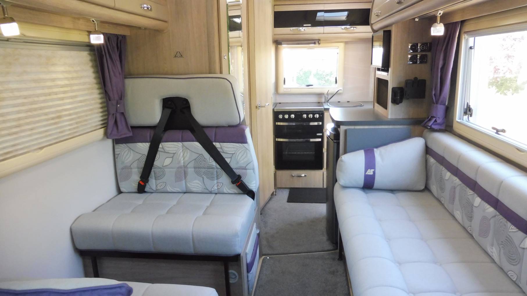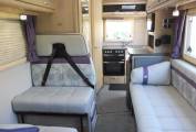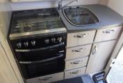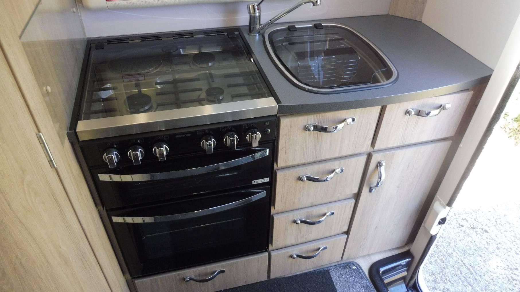 This is a luxury motorhome with everything you need for travelling in style. Entering on the rear right-hand side you have the end kitchen which is very well-equipped with a large oven, separate grill, cooker hood, four burner hob (3 gas 1 electric), sink with mixer tap, microwave, three-way fridge with icebox and good storage space from both base cupboards and roof lockers.