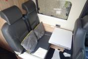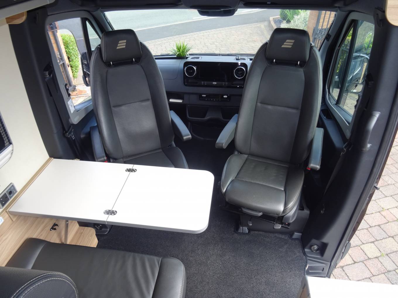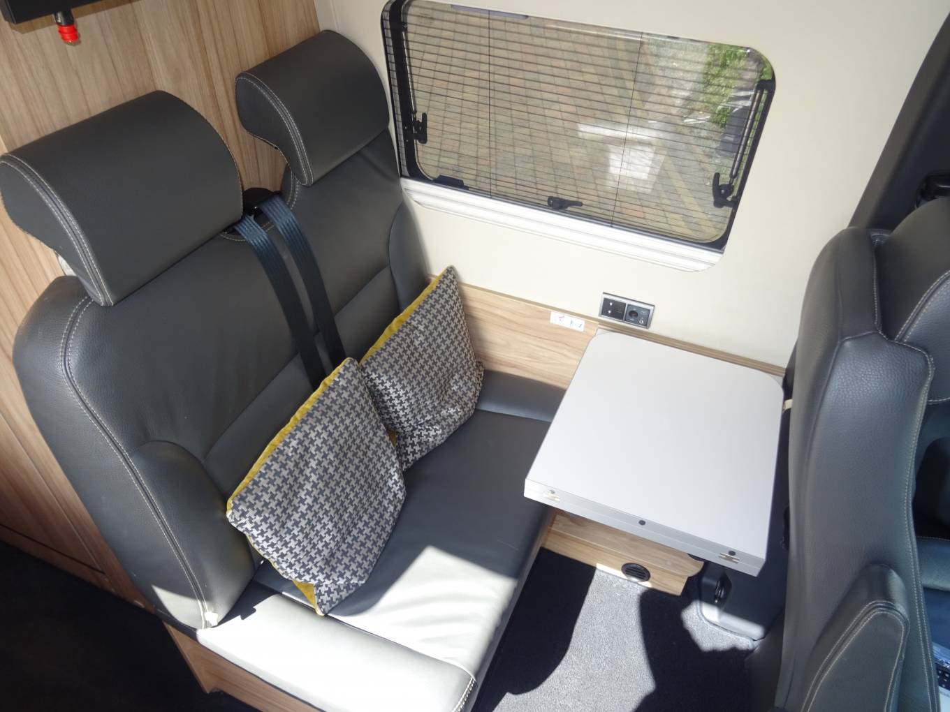 Both front seats swivel to form seating/dining area for four people. You’ve a fold out table and a TV on a fold out swivel bracket.