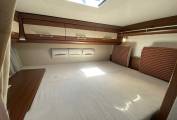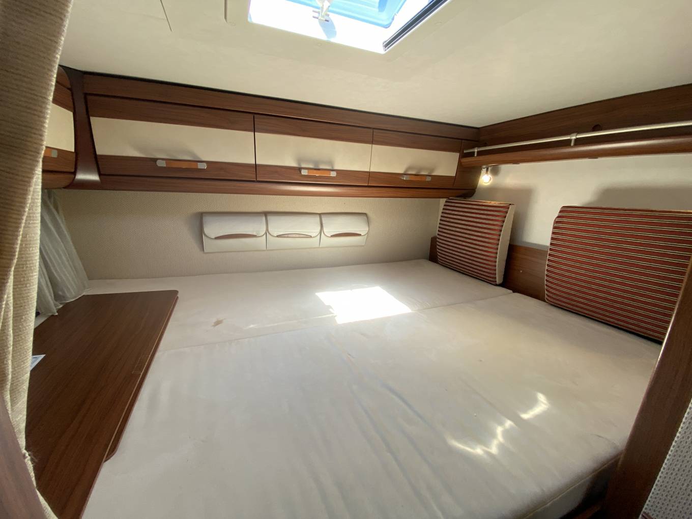 Sleeping Area • Transverse double bed • Two access steps with storage • Window kick boards • Skylight • Reading lights • Wardrobe space with valuables safe • Overhead lockers • Large manual drop-down full width second double bed over cab and living area.