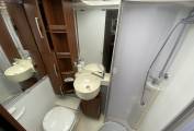 Washroom • Integral shower with circular screen • Washbasin • Chrome shower tap • Mirror • Medicine cabinet • Thetford swivel cassette toilet with electric flush • Skylight • Blown heating.