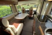 Living Area • L shape front lounge with dinette seating • Dual trim upholstery in excellent condition throughout • Both cab captain chairs swivel to face the living area • Truma Combi space and water heating • Adjustable dining table • Hide-away TV• Skylight • Spotlights • Overhead locker storage • Flyscreens and blinds on windows • Mains sockets.