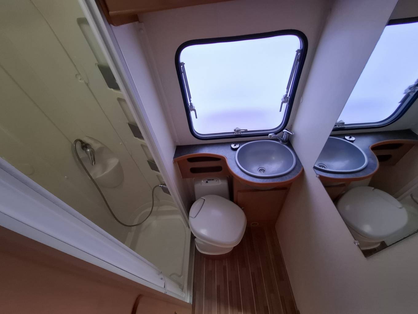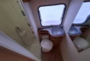 At the rear of the vehicle is the bathroom with a toilet and hand basin, and a screened shower cubicle.