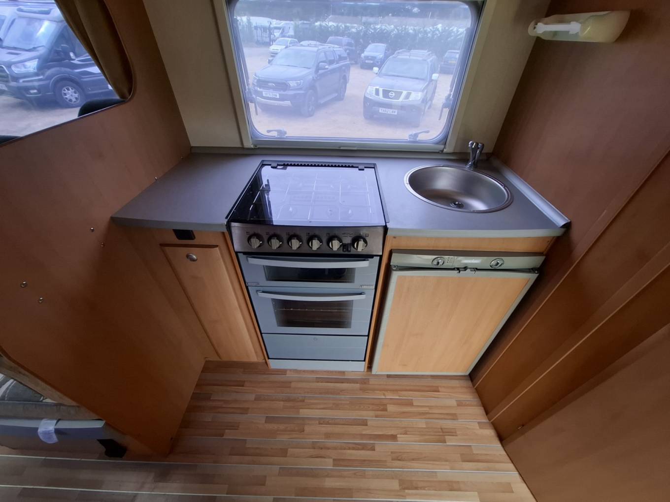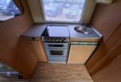 Behind the seating area is a fully fitted kitchen, with a fridge with a freezer box, a 4-burner gas hob, a combination oven/grill, and a sink.