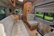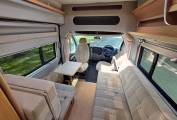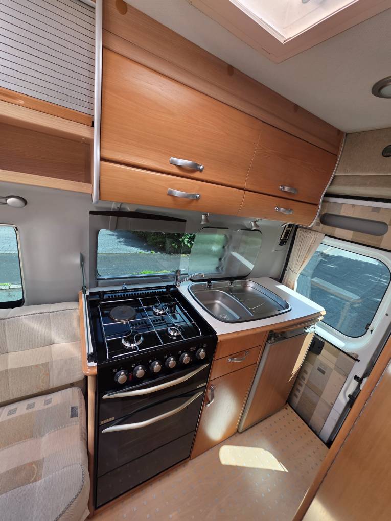 At the rear of the van there is a side kitchen with dual-fuel hob, oven, grill and 3-way fridge. Opposite you find the compact washroom with toilet, foldable sink and shower.