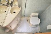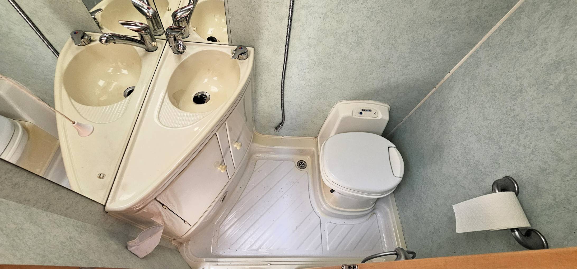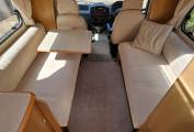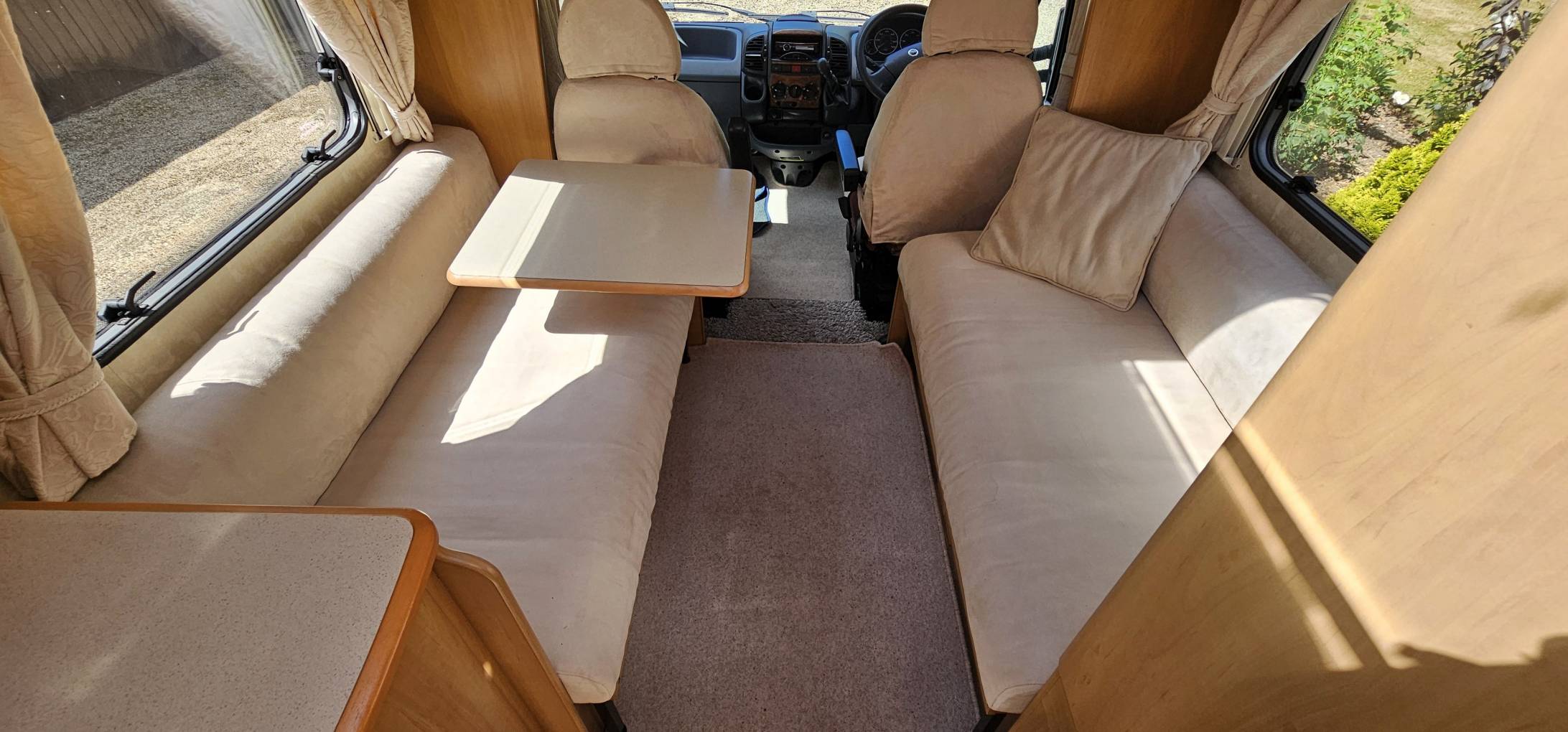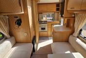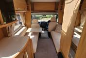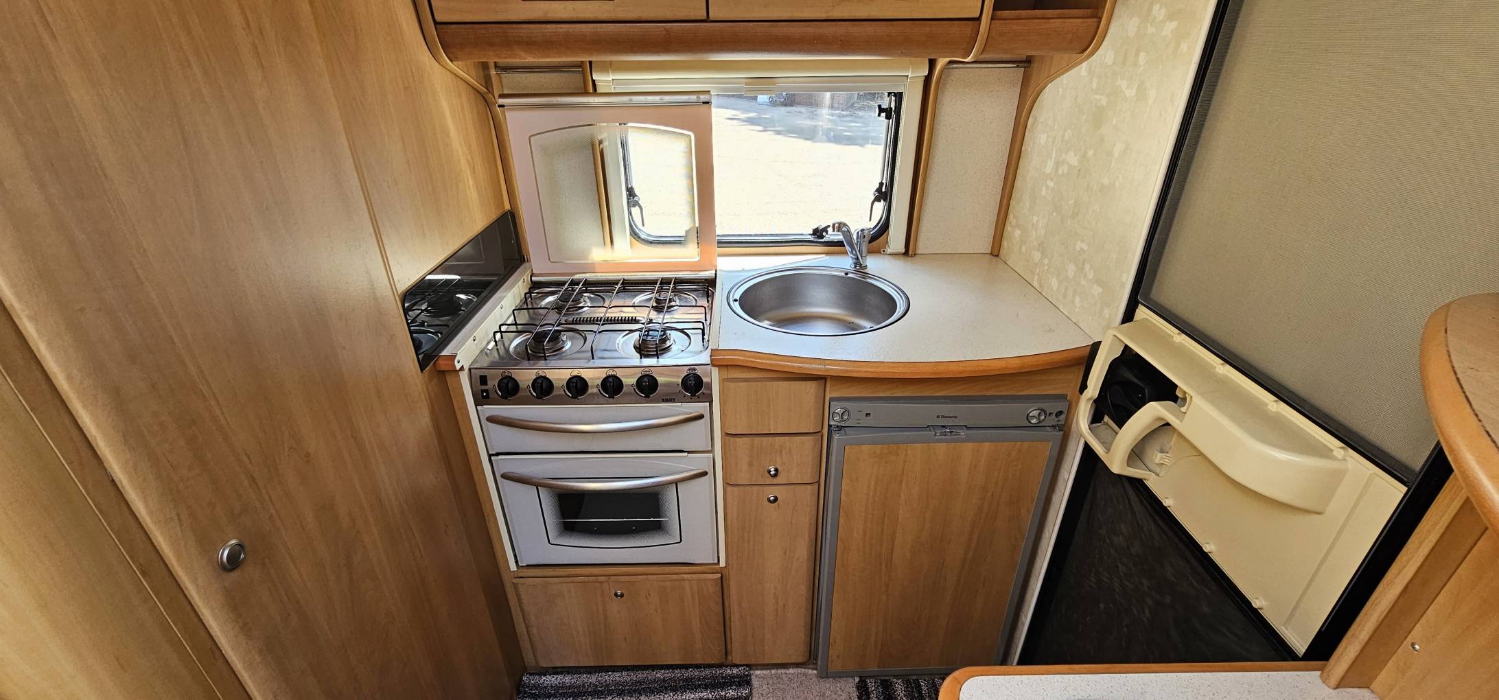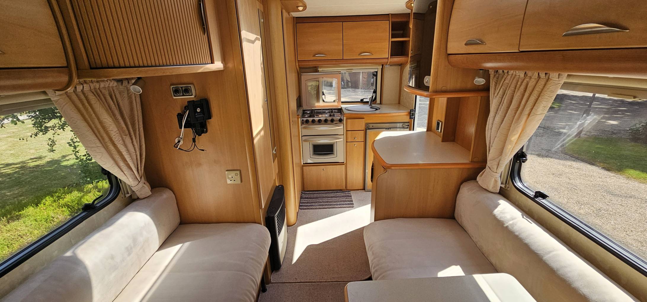 This 2-berth model features a front lounge with two side-facing bench seats that convert into a double bed, an end kitchen with 4-burner hob, grill, oven, sink and fridge, and a rear washroom with cassette toilet, shower and basin.