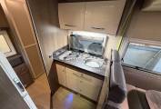 Moving rear is the galley kitchen that consists of: stainless steel bowl shaped sink with chrome mixer tap above; 3 burner gas hob, both with glass lids to close; drawer and cupboard space above and below. On the opposite side is a large Thetford absorber fridge with separate freezer box. Above this there is a grill.