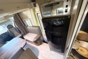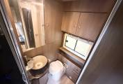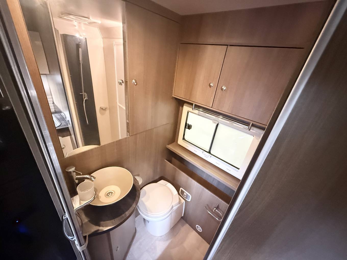 Finally to the rear is the all in one bathroom with separate shower cubicle with Perspex doors to close. The toilet is a cassette style Thetford fresh water flush unit with a swivel head, to the left a grey sink with chrome mixer tap. The bathroom benefits from a large wardrobe with hanging space or shelves, this can be accessed from inside or out of the Motorhome.